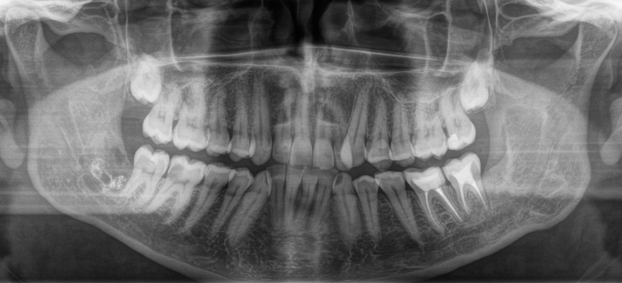 Что мы видим? Темное пятно в области проведенной операции сохраняется, что нормально, потому как прошел всего месяц с момента удаления. Заживление проходит хорошо, каких-либо проблем в восстановлении не наблюдается. Не зря я отметил пунктиром область зуба мудрости с противоположной стороны, потому как там есть точно такая же фолликулярная киста, как и слева, но на начальных этапах своего роста.
