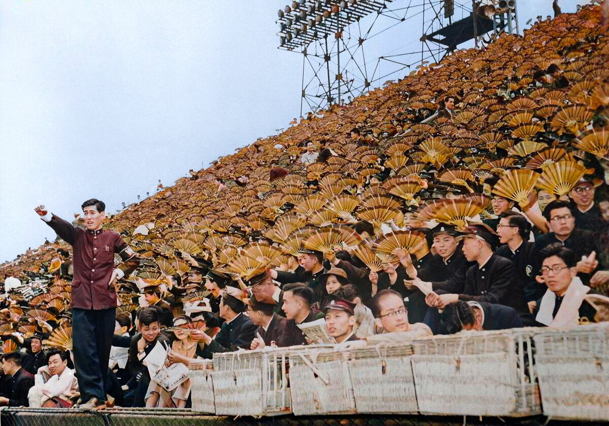 Зрители с веерами посещают бейсбольный матч между университетами Васэда и Кейо в парке Мэйдзи. Токио, 1 июня 1954 года.