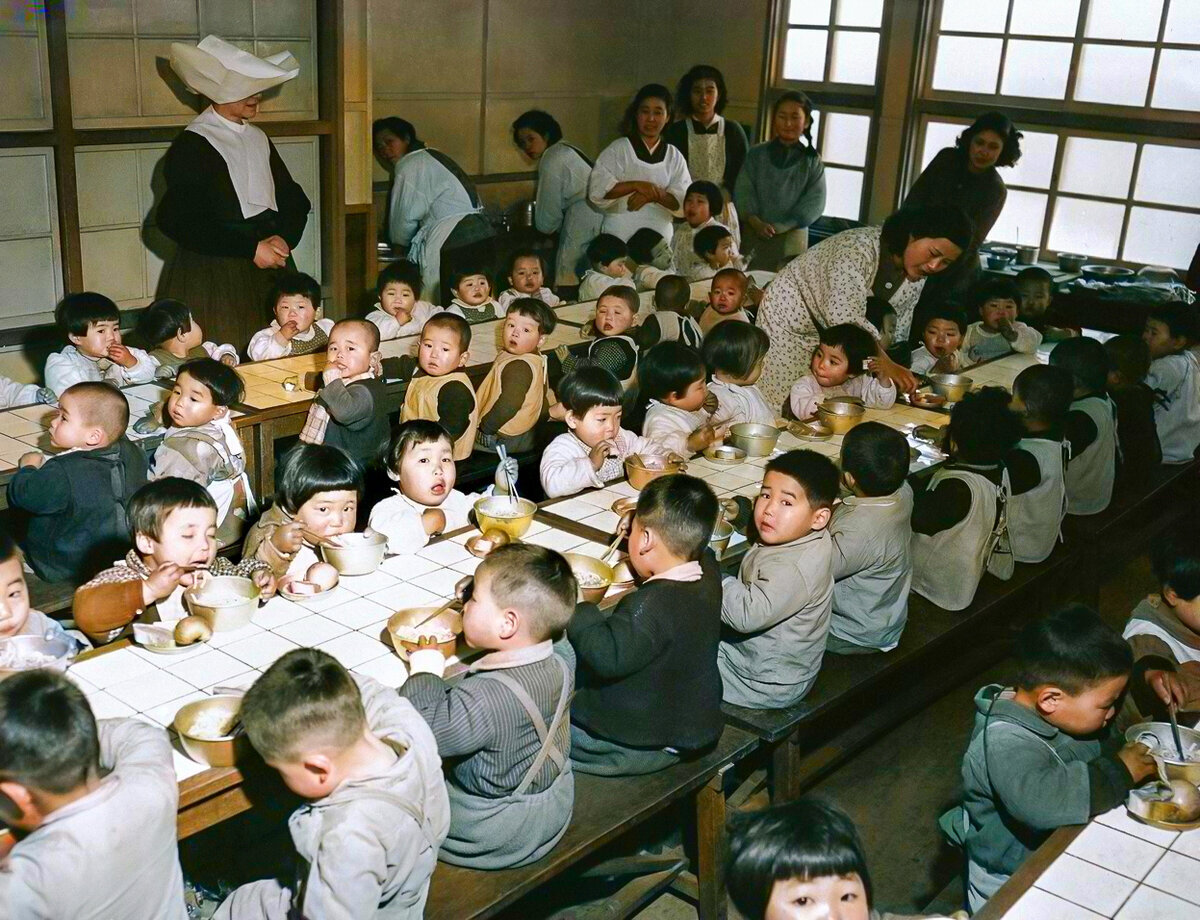 В этой столовой детского дома в Осаке 160 сирот ежедневно кормят продуктами, предлагаемыми Волкодавами 27-го пехотного полка армии США, 19 февраля 1951 года.