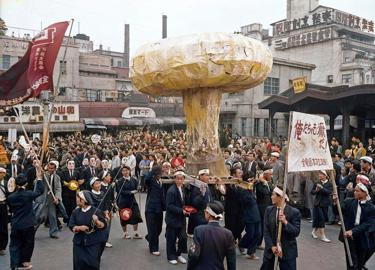 Точную копию атомного гриба выносят на улицы Токио в знак протеста против запланированных англичанами испытательных бомбардировок водородной бомбой. 1 мая 1957 года.