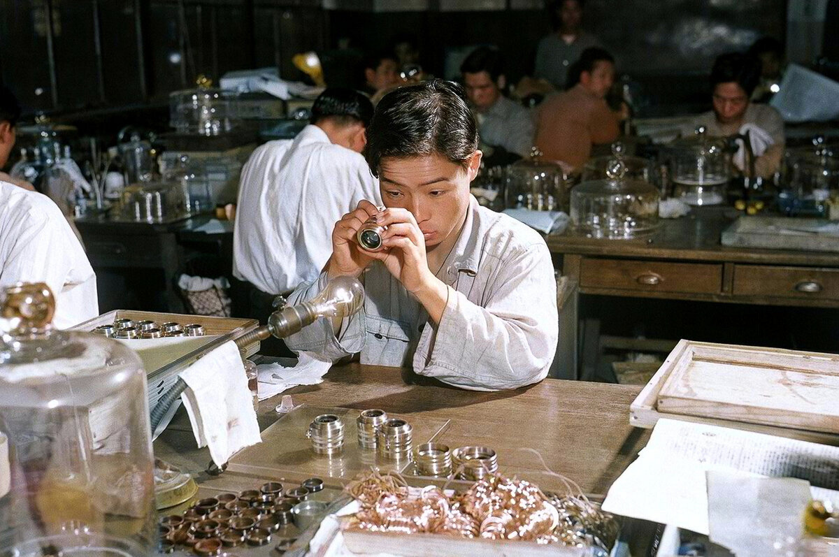 Проводится проверка объектива фотоаппарата Nikon на заводе. Токио, 1952 год.