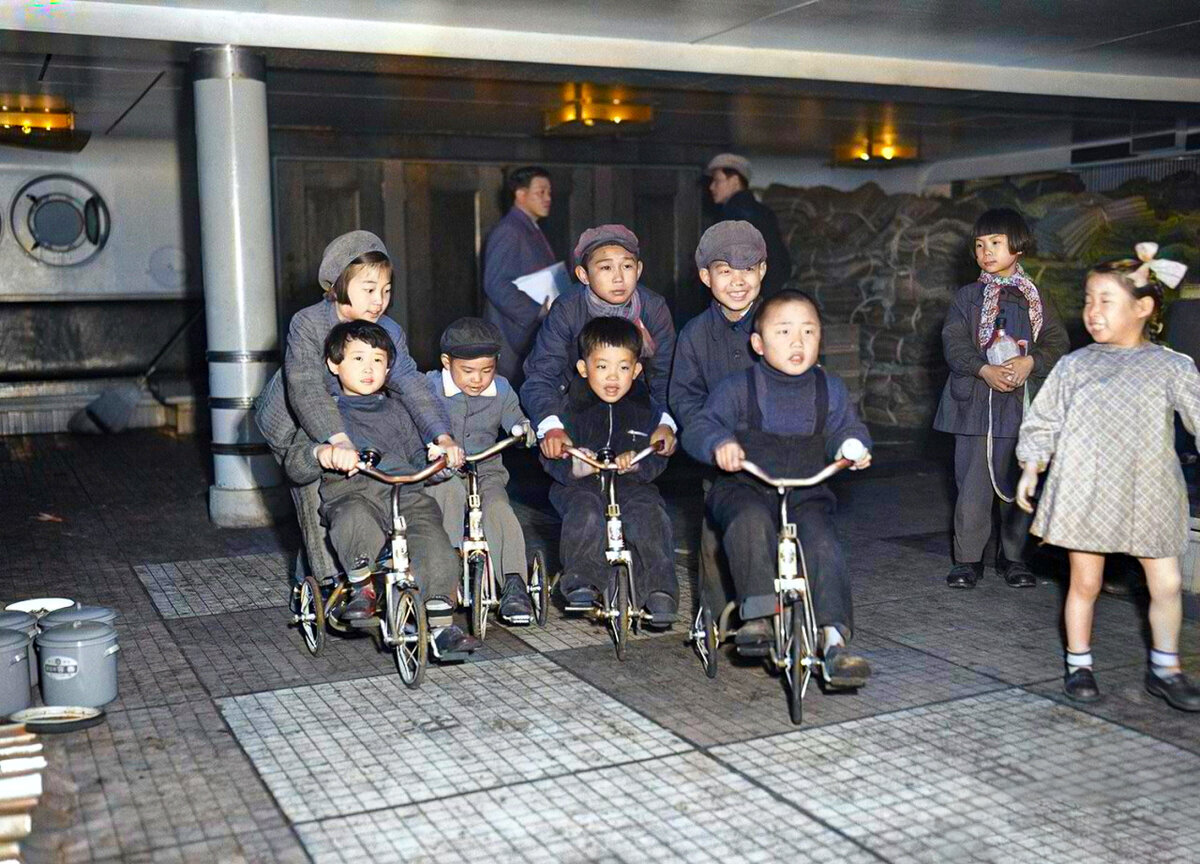 Дети из семей, репатриированных из Китая, катаются на велосипедах, подаренных благотворительными организациями, 24 марта 1953 года.