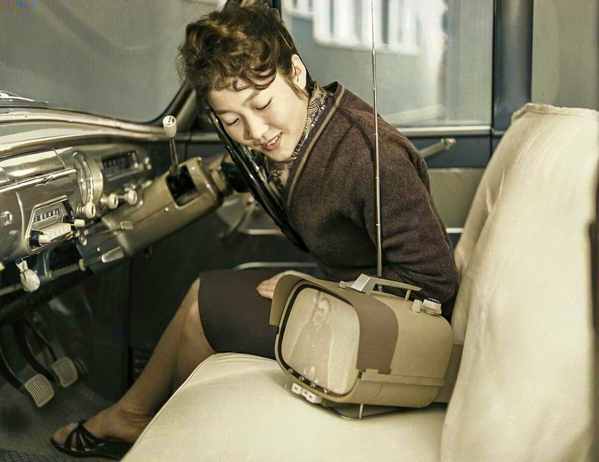 Томико Кавабата сидит в своей машине и восхищается своим новеньким портативным телевизором Sony. Встроенная батарея способна питать 8-дюймовый (20 см) дисплей в течение трех часов. 5 января 1960 года.