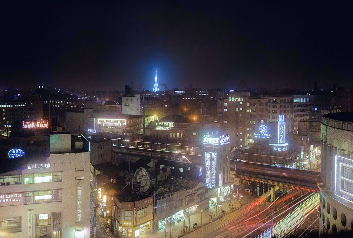 Десять тысяч лампочек освещают 157-метровую башню Радио Токио в центре столицы. Тысячи людей толпились перед своими окнами и возле телевизионной станции, чтобы сфотографировать зрелище, известное как величайшая иллюминация в мире, 1955 год.