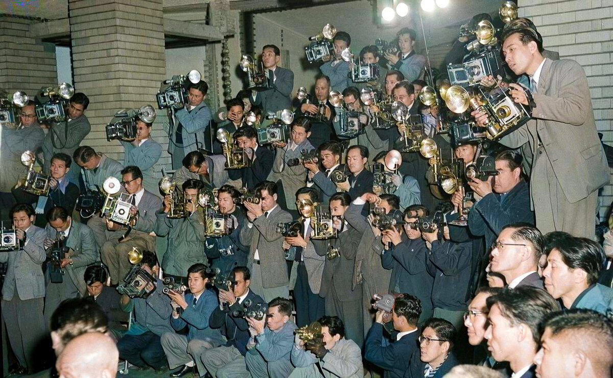 Сорок пять фотографов фотографируют новое правительство Японии перед официальной резиденцией премьер-министра в центре Токио. 17 декабря 1954 года.