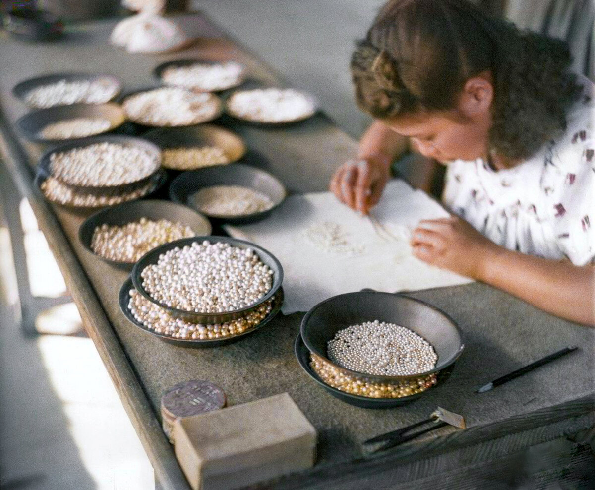 Молодая девушка тщательно сортирует культивированный жемчуг с жемчужной фермы Кокичи Микимото, 12 октября 1949 года.