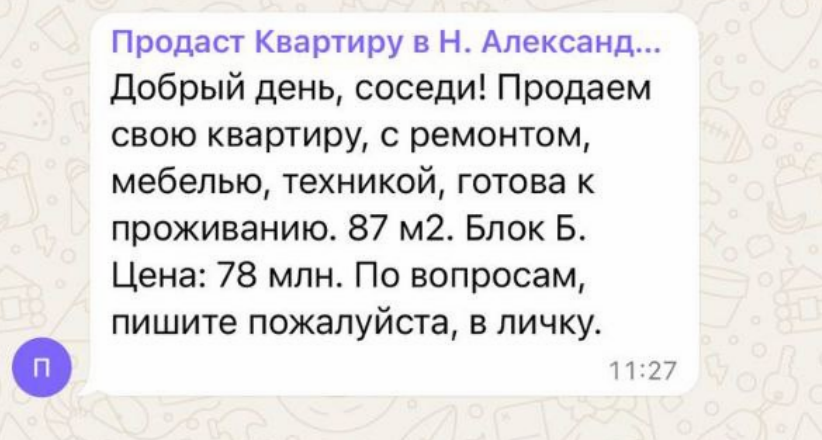 Скинули тут знакомые из чата жильцов объявление ну и контакт.