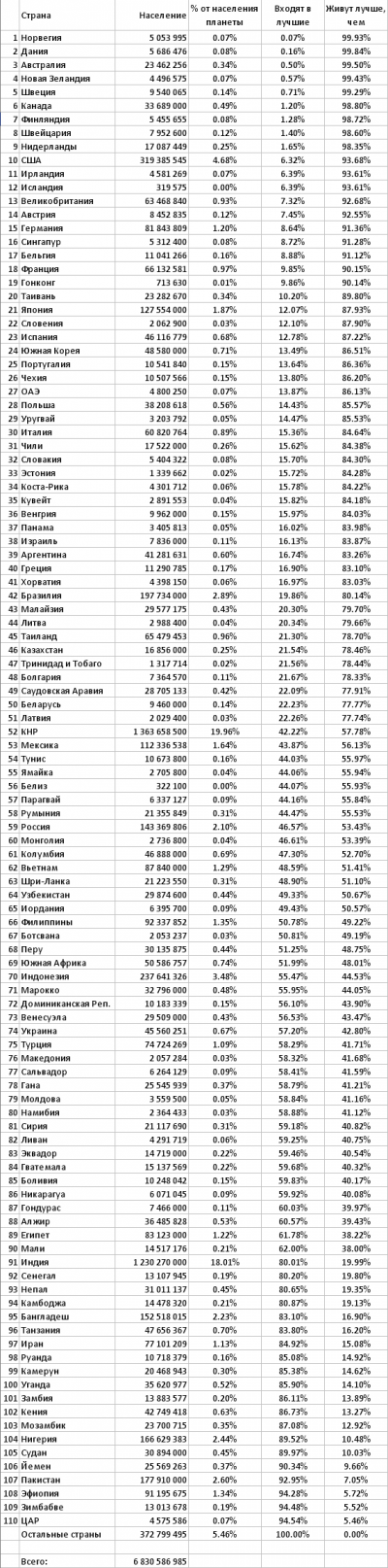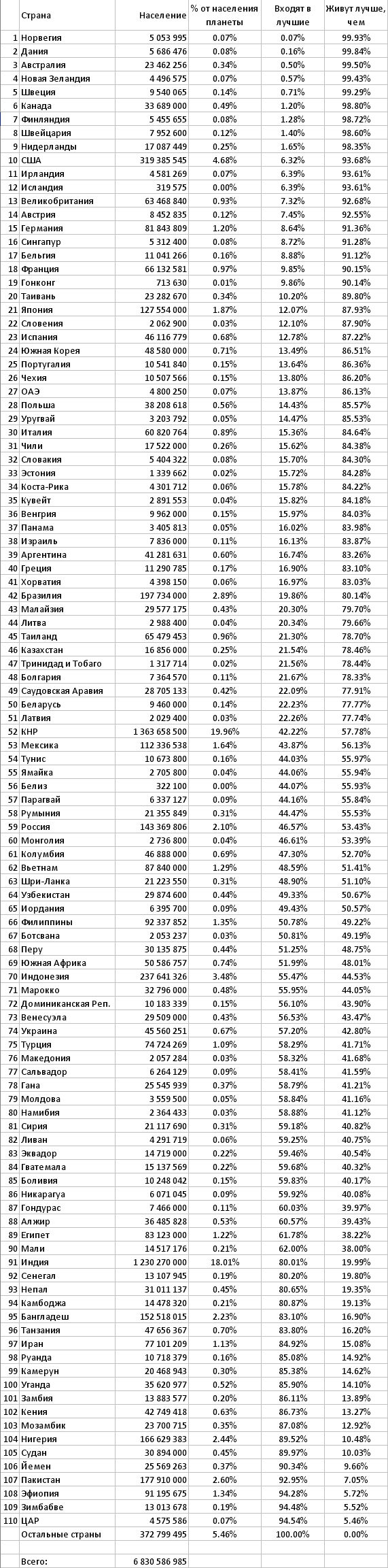 Если мы продолжим таким образом спускаться по таблице, то получится, что россияне живут лучше, чем 53.43 % жителей всей планеты.