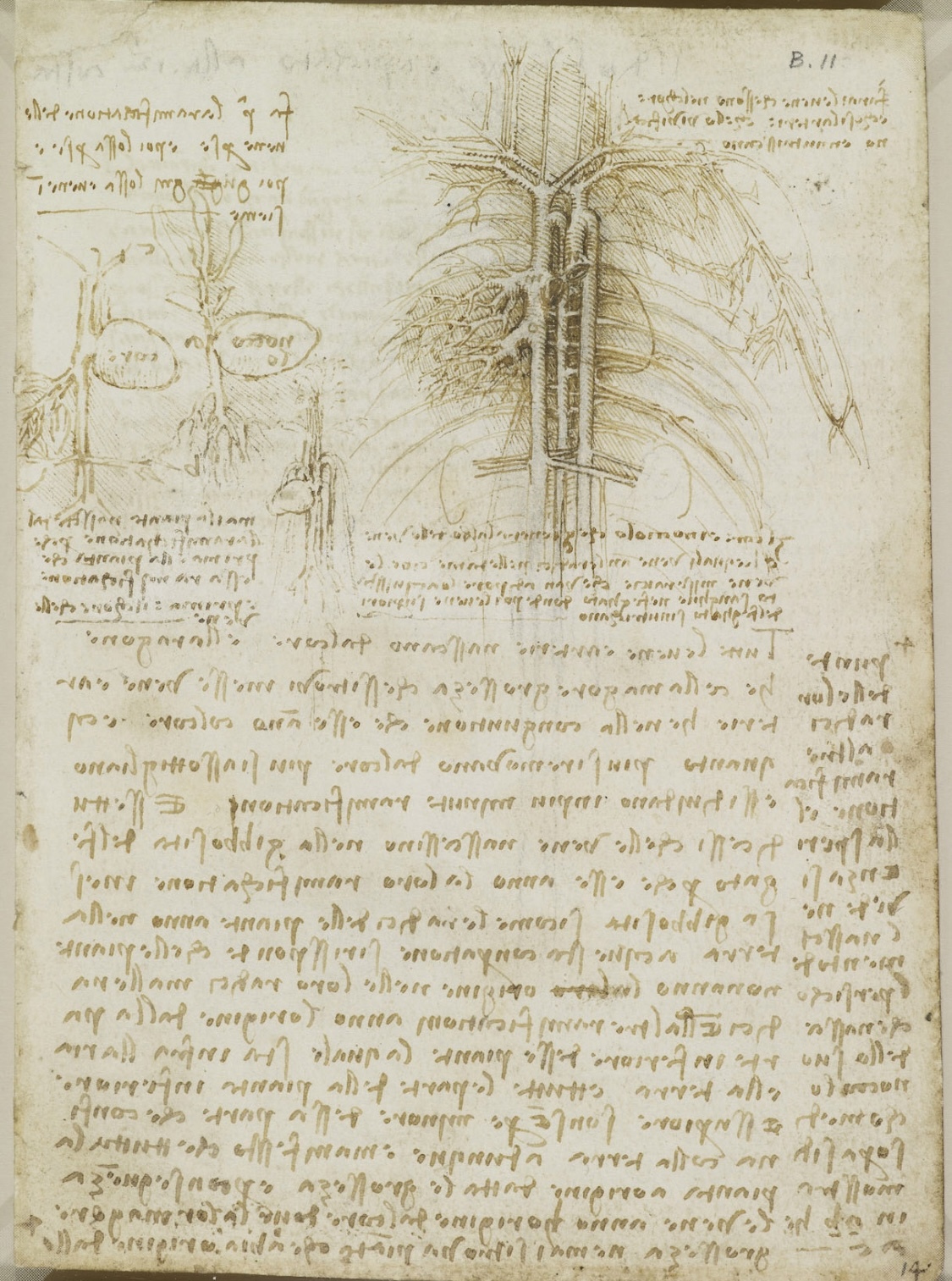 Тот самый рисунок Леонардо, в верхнем правом углу заметка где он подметил изменения сосудов у пожилых.