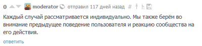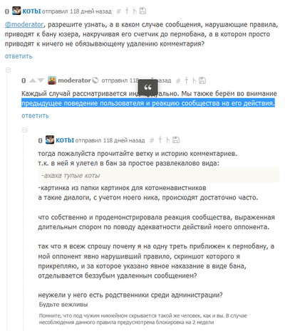 если отмотать ту ветку ниже, то видно как я, выйдя из бана, пытаюсь узнать у модераторов критерии такого странного модерирования, но что я получаю ответ (см. картинку), которая полностью демонстрирует субъективизацию наказаний. также можно видеть насмешки от моего оппонента над тем, что я вынужден повторно звать модераторов и писать в саппорт.
