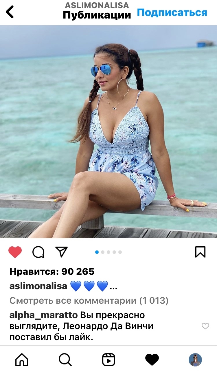 Мона Лиза, эталон женской красоты в средние века. Женщина завидная, да и в профиль её хочется любоваться. Поиск в гугол на запрос Mona Lisa instagram выдаёт ссылку на профиль https://instagram.com/aslimonalisa?utm_medium=copy_link Мона Лиза 21 века. Похожа на принцессу из индийских сказок или невесту из современных Том и Джерри. Если смотрели фильм, такой же индийский колорит в современной обработке с Томом и Джерри.