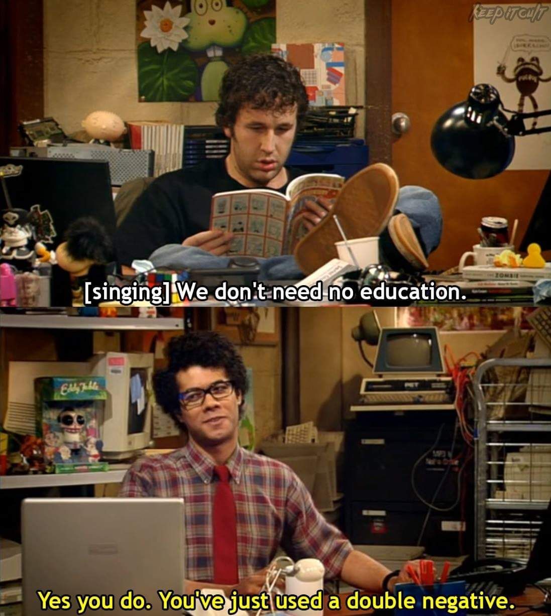 Kuchka70 6 лет назад Пост обречен на минусы. И тем не менее: [напевая] We don't need no education.(Нам не нада не учица)— Нужно. Ты только что использовал двойное отрицание. Раскадровка Образование Английский язык Грамотность Двойное отрицание Pink Floyd The Wall The IT crowd