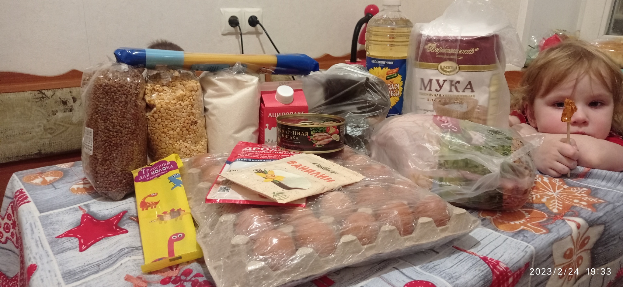 Курица 2 кг, макароны спагетти 1 п, гречка 1 п, горох 1 п, лоток яиц С1, мука 2 кг, ванилин 15 г, дрожжи 100 гр, подсолнечное масло 1 л, сахар 1 кг, свекла 1 кг, килька в томатном соусе 1 банка, кисломолочный напиток, типа простокваши, палочки для молока и леденцы, остаток которого уныло торчит на дыбе в руках палача.