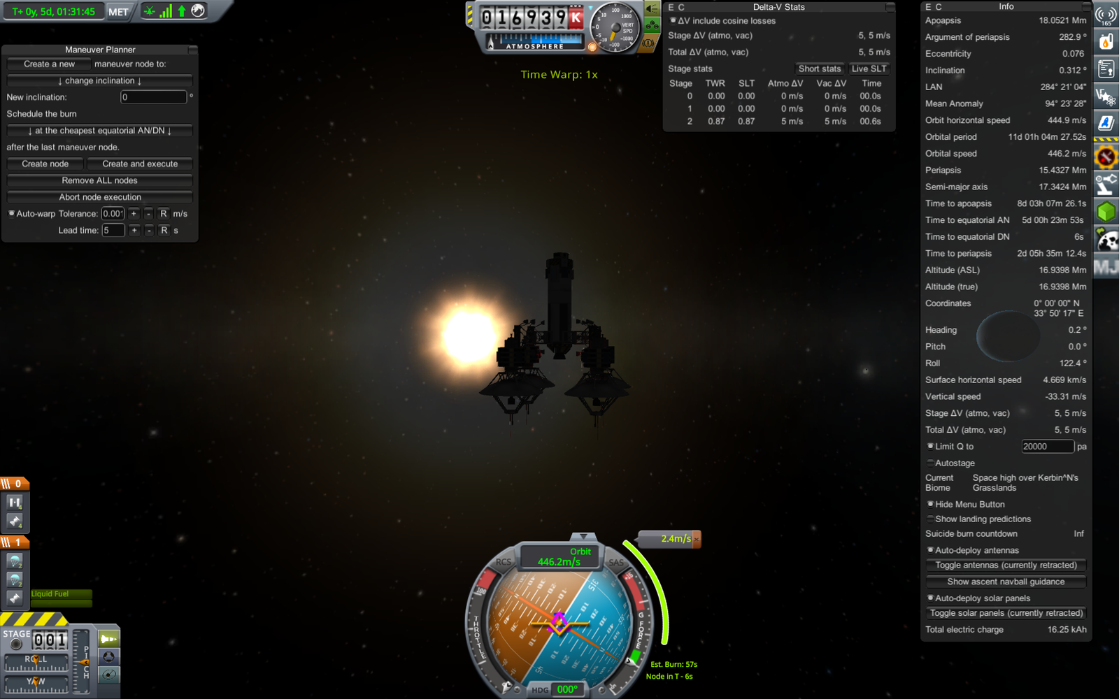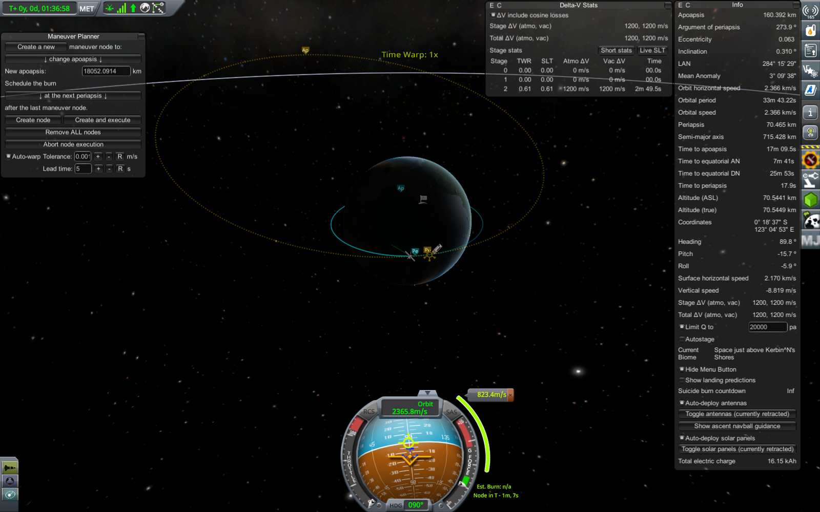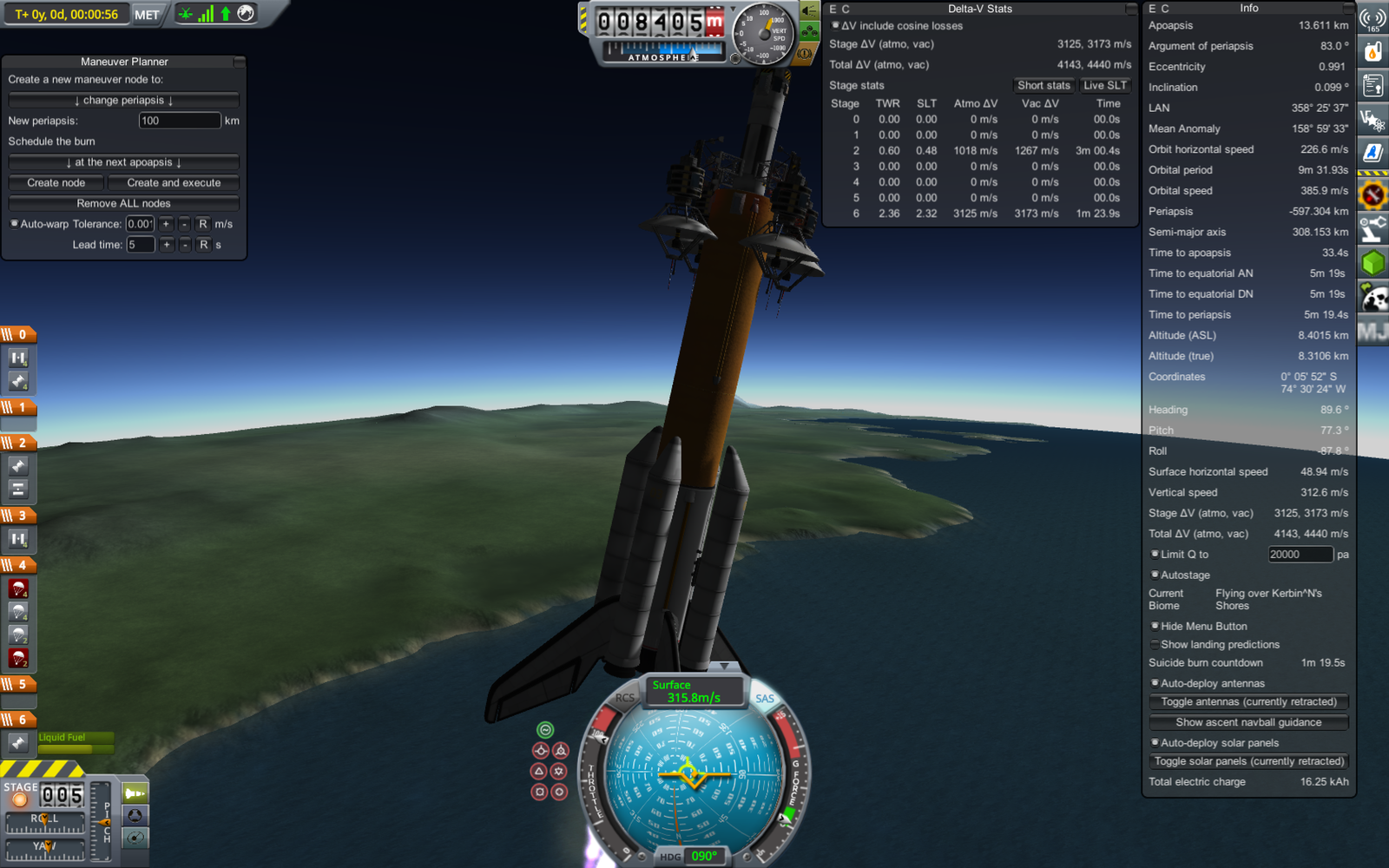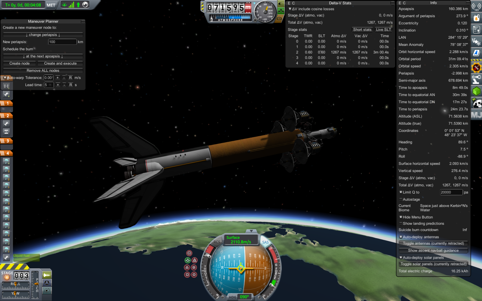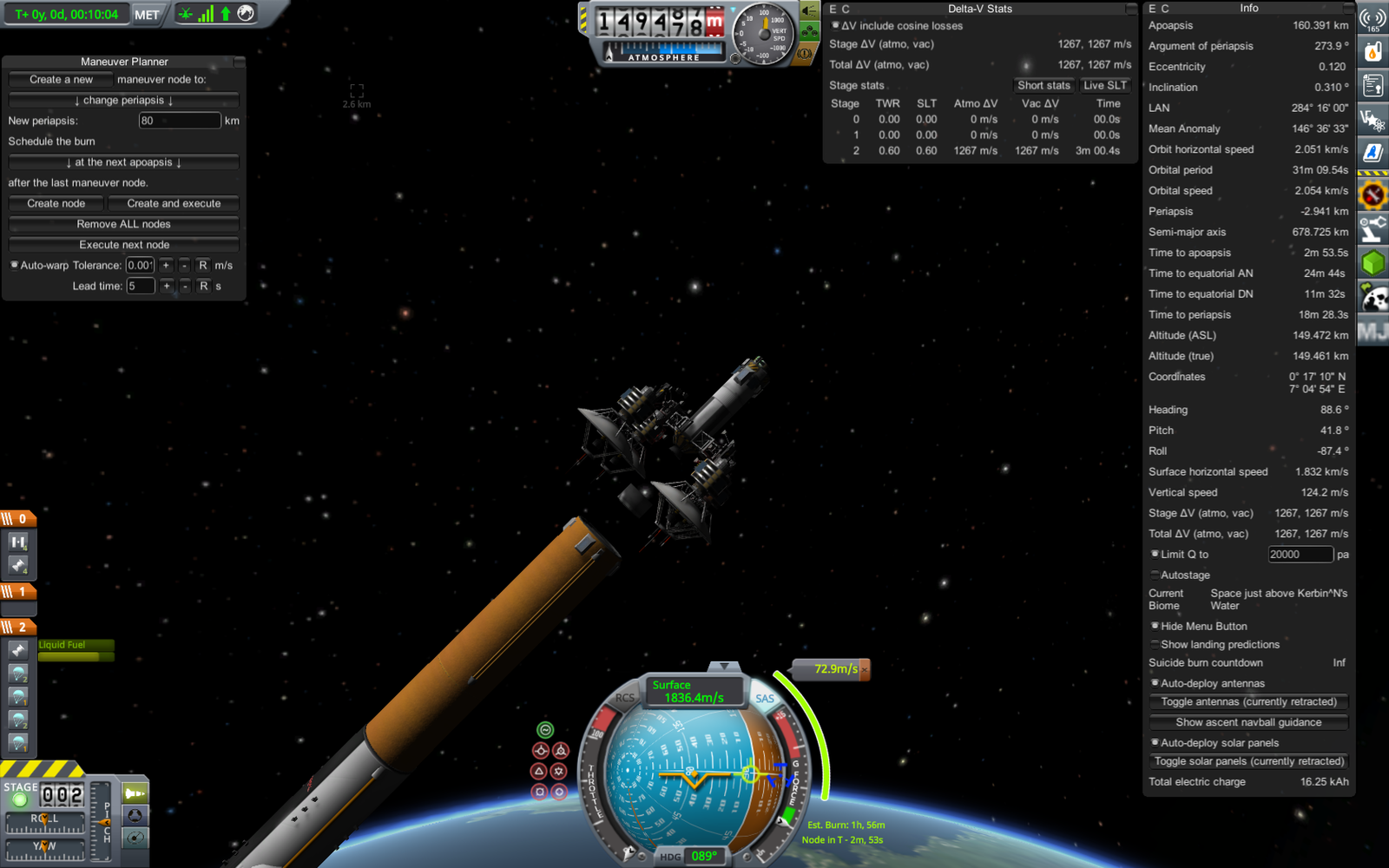 Отделение нижней ступени ракеты-носителя. На момент отделения орбита ракеты - 160 х -3 км, лишь слегка задевает поверхность, так что нижняя ступень войдет обратно в атмосферу - попытаемся ее посадить в океан для переиспользования. Верхняя же ступень выполнит маневр скругления орбиты (ускорение на 72.9 м/с, уже запланировано на этом скриншоте), и, соответственно, перейдет на низкую орбиту Кербина. Похожую схему запуска использовали Шаттлы - основной двигатель выключался незадолго до достижения орбиты, после чего производилось отделение топливного бака (падающего обратно на Землю), а сам Шаттл с использованием системы орбитального маневрирования довыводился на орбиту.