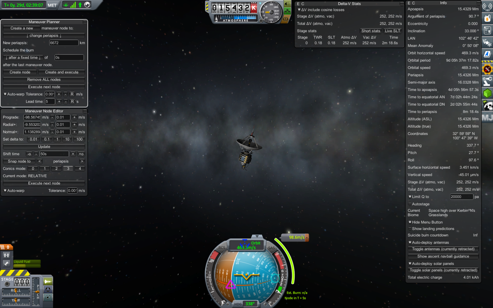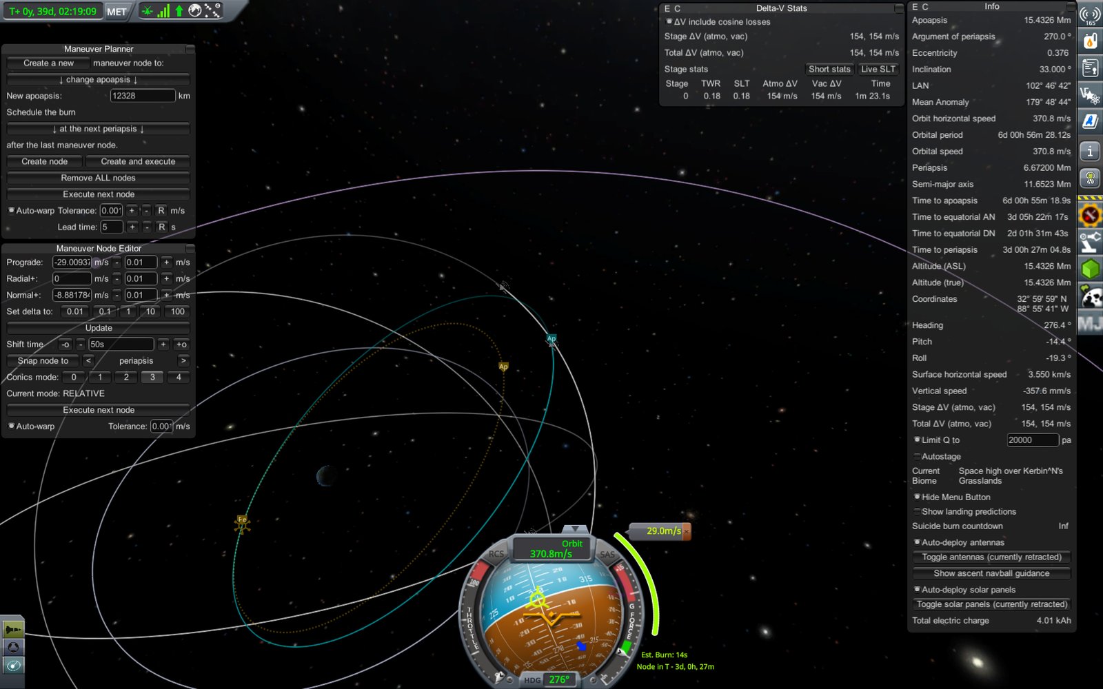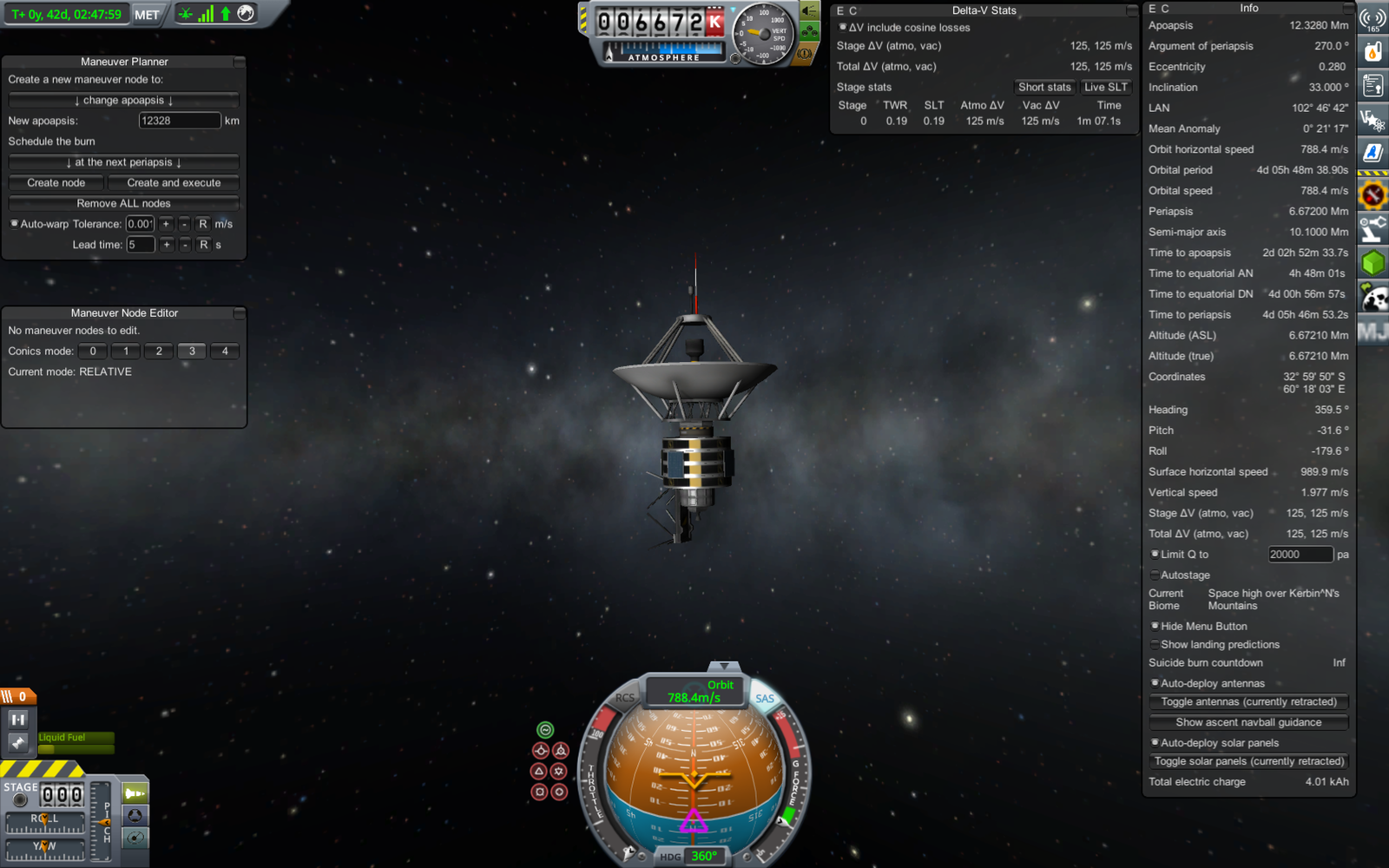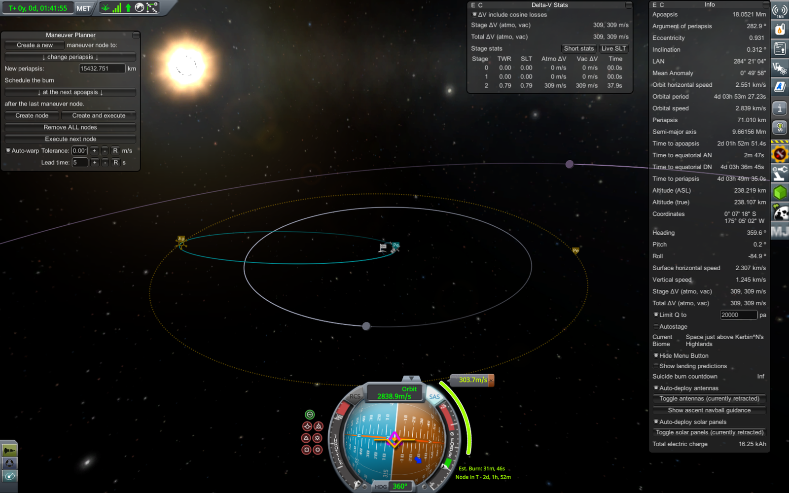 Ракета на переходной орбите (71 х 18052 км). Из-за того, что предыдущий маневр был перевыполнен, пришлось сделать лишнюю коррекцию, потратив драгоценное топливо. В итоге следующий маневр (переход на резонансную орбиту) требует 303.7 м/с изменения скорости, а у нас осталось всего 309. Дальнейшие маневры придется делать очень аккуратно, и ни о каком возврате верхней ступени на Кербин речь уже не идет.