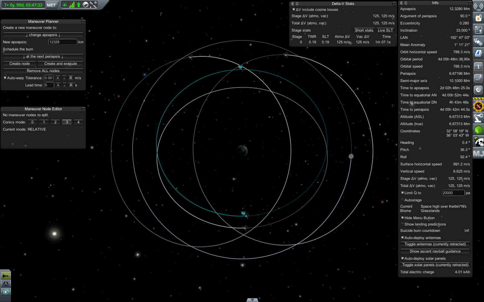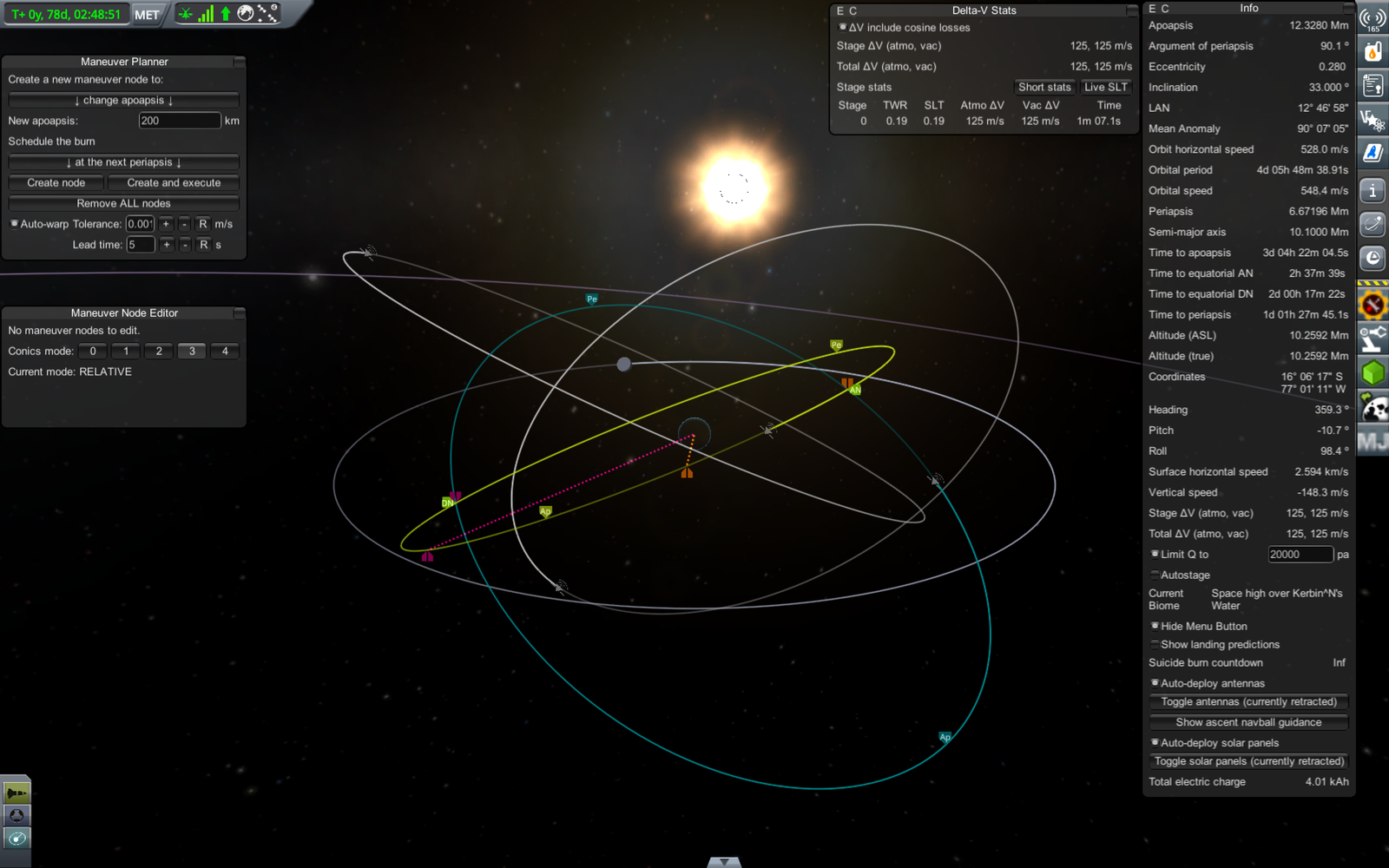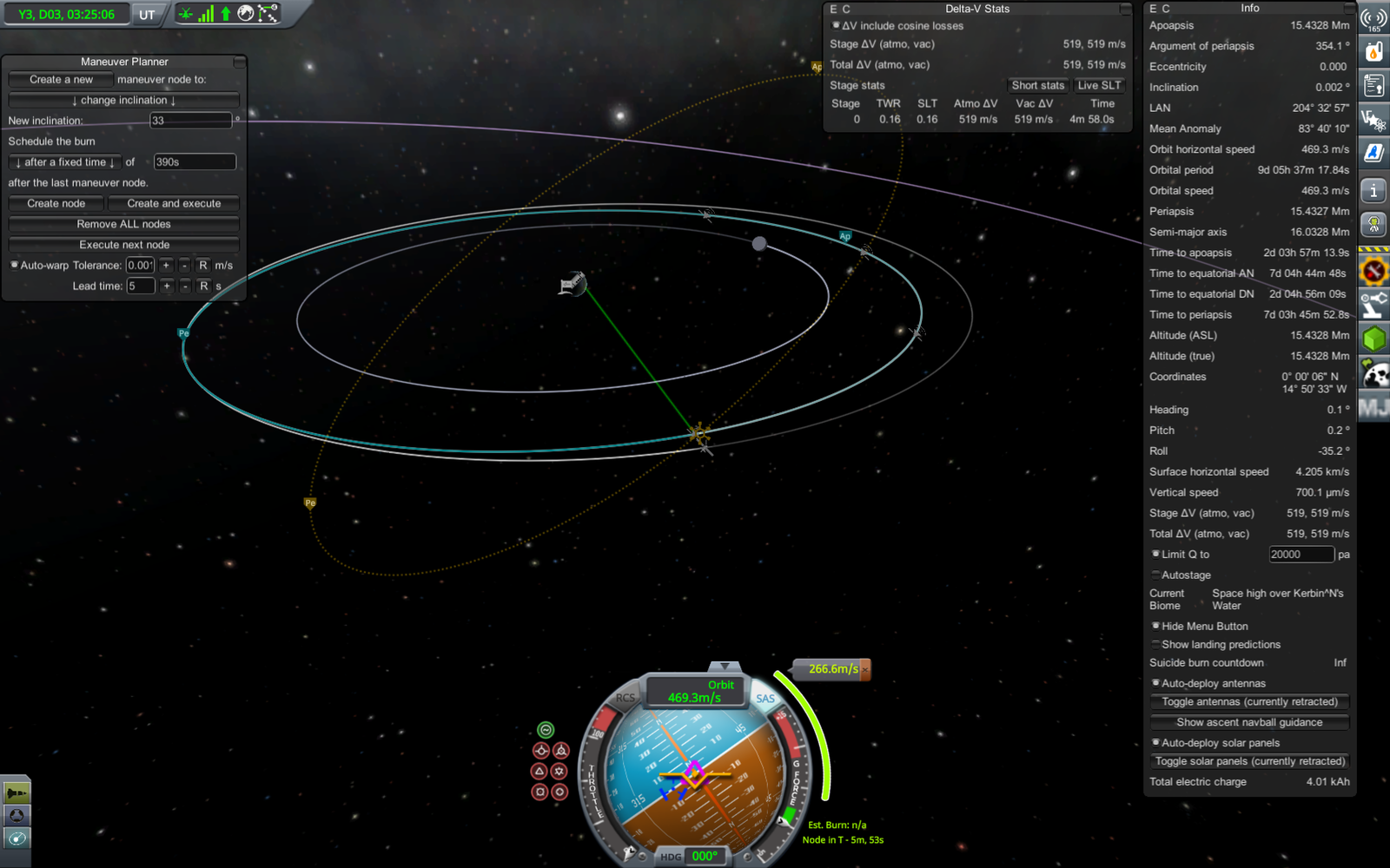 Ракета на переходной орбите (71 х 18052 км). Из-за того, что предыдущий маневр был перевыполнен, пришлось сделать лишнюю коррекцию, потратив драгоценное топливо. В итоге следующий маневр (переход на резонансную орбиту) требует 303.7 м/с изменения скорости, а у нас осталось всего 309. Дальнейшие маневры придется делать очень аккуратно, и ни о каком возврате верхней ступени на Кербин речь уже не идет.