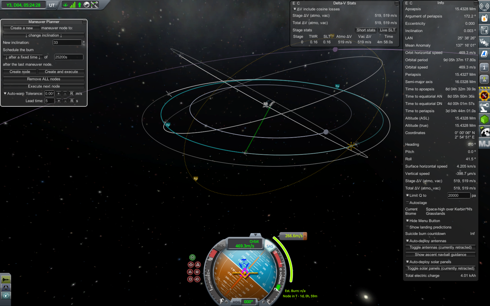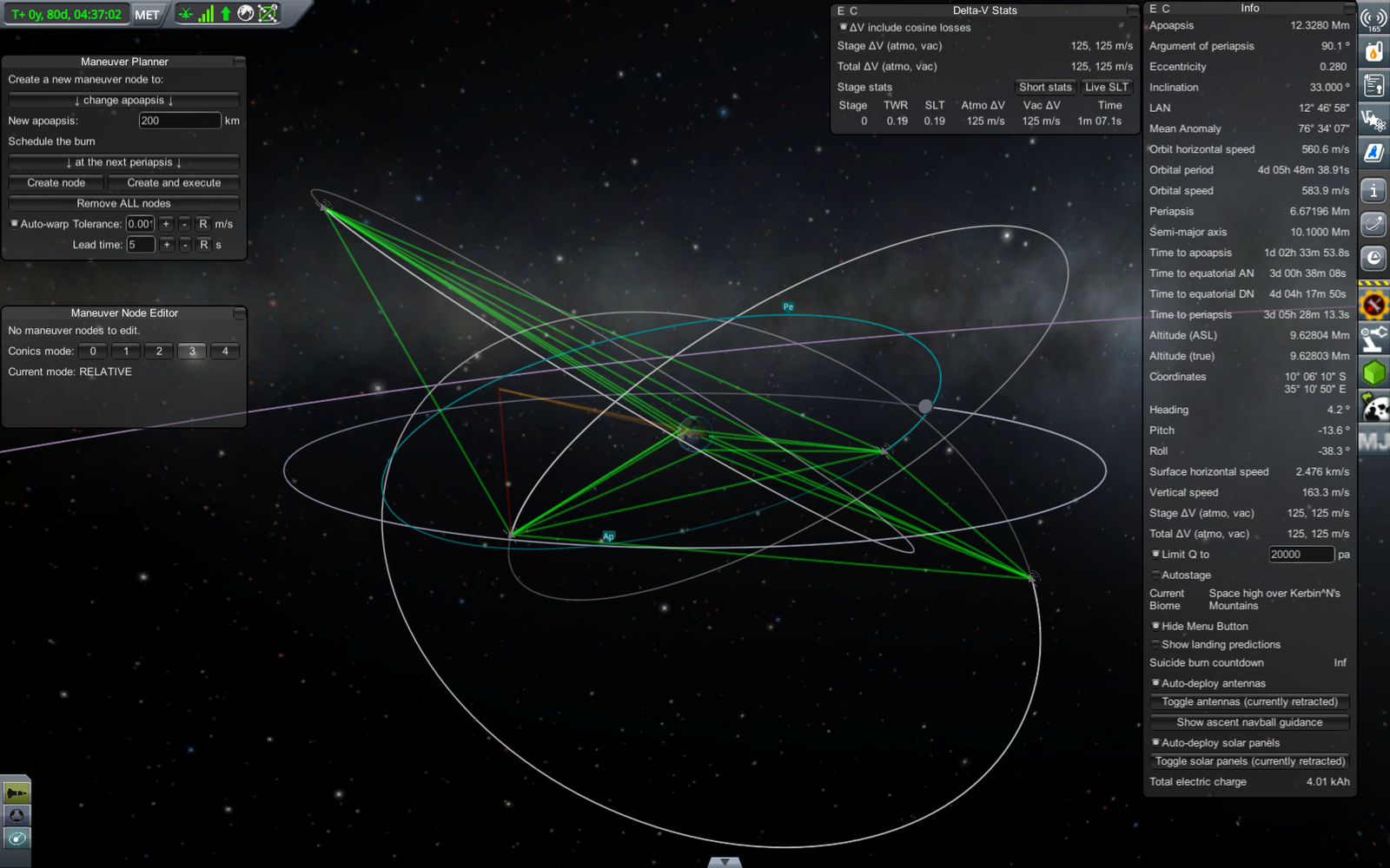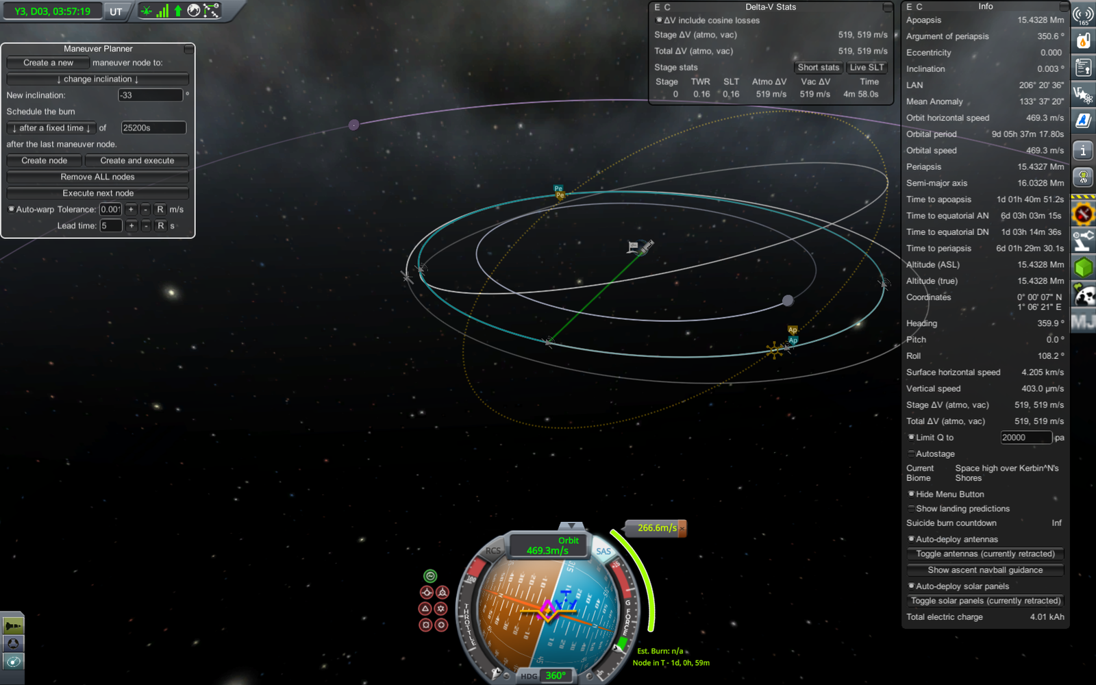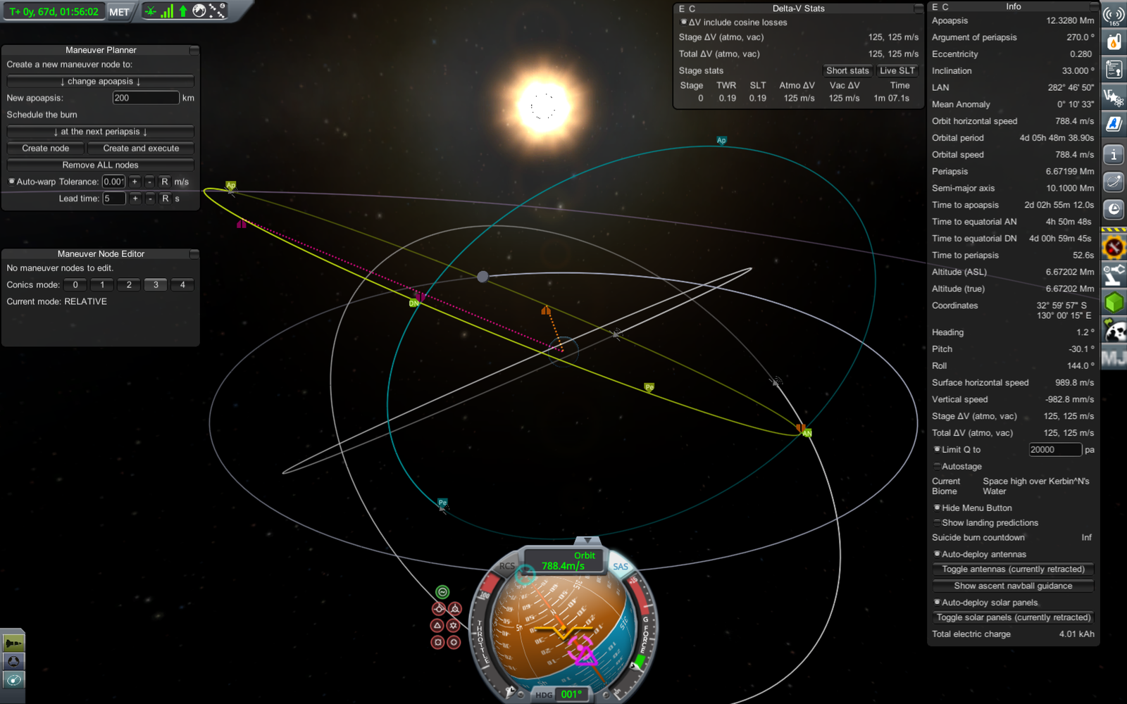 Ракета на переходной орбите (71 х 18052 км). Из-за того, что предыдущий маневр был перевыполнен, пришлось сделать лишнюю коррекцию, потратив драгоценное топливо. В итоге следующий маневр (переход на резонансную орбиту) требует 303.7 м/с изменения скорости, а у нас осталось всего 309. Дальнейшие маневры придется делать очень аккуратно, и ни о каком возврате верхней ступени на Кербин речь уже не идет.