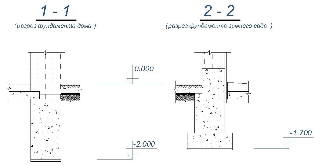 Примыкание зимнего сада к дому выполнено деформационным швом. По этому деформационному шву в дальнейшем мы будем примыкать их заглубляемые фундаменты. Деформационный шов в данном конкретном случае должен быть вертикальным по всей высоте без каких-либо горизонтальных участков.