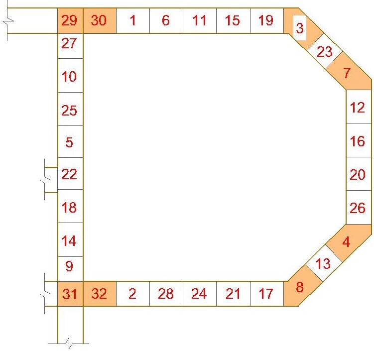 На схеме есть восемь оранжевых захваток, одни из которых находятся на углах зимнего сада, другие находятся на стыках дома и зимнего сада. Причем в парах 29-30 и 31-32 29 и 31 захватки имеют единственный доступ с внутренней стороны зимнего сада – со стороны второй своей пары. Поэтому заливать эти захватки необходимо одна за другой. Такой способ заливки – единственное правильное решение, а расположение заливаемых захваток рядом не противоречит принципу равноудаленного распределения захваток, поскольку каждая захватка в паре относится к разным зданиям.
