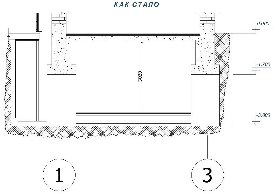 Заказчик поставил задачу сделать подвал высотой 3м. Из этого условия была принята глубина заложения нового фундамента – 3800мм от уровня чистого пола против существующих отметок - 2000мм и 1700мм соответственно. Таким образом, фундамент будет заглубляться еще на 1800 – 2100мм от существующей отметки.