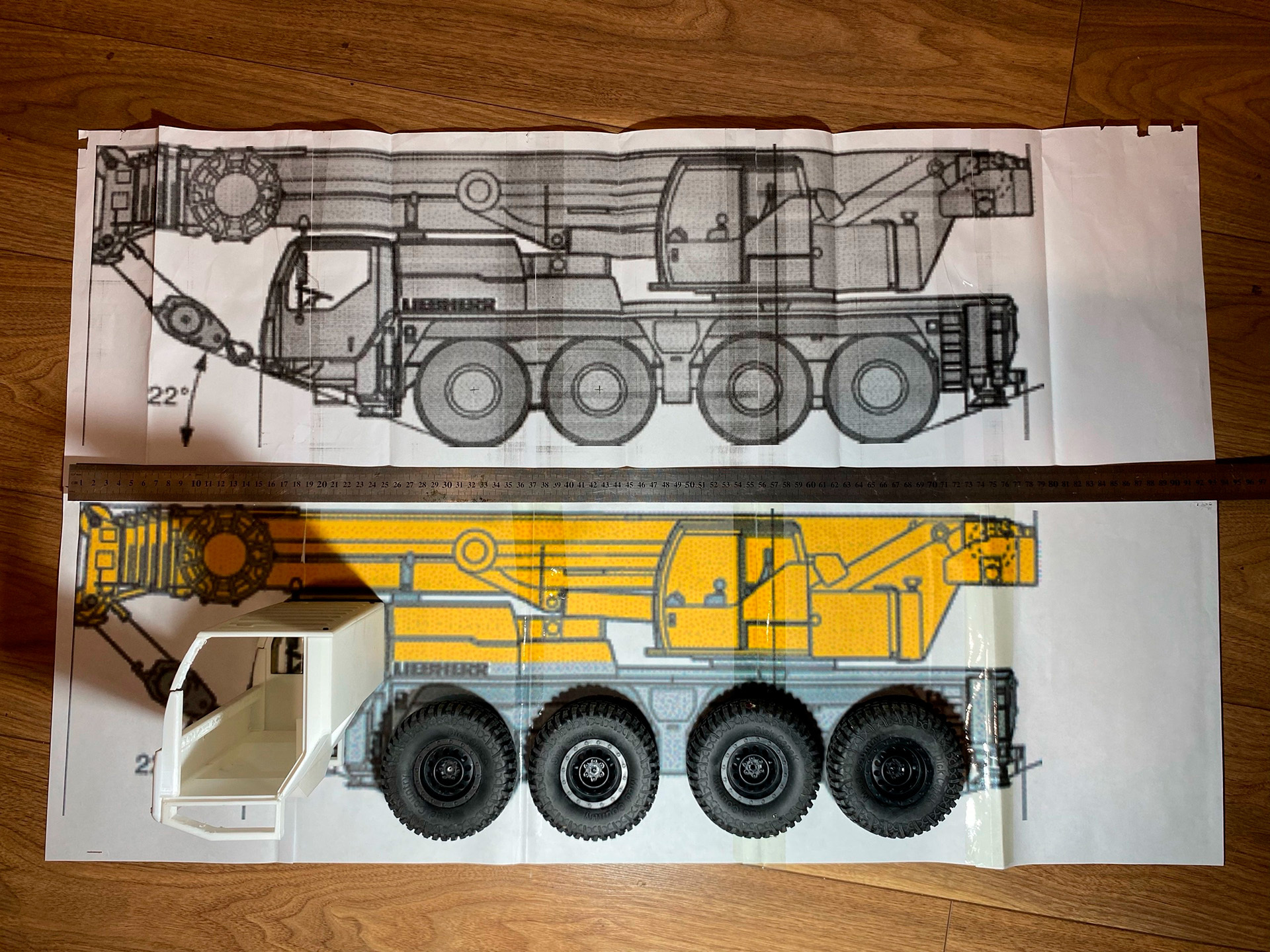 С чего начинается любой проект? Конечно же с чертежа! Раздобыв в интернете картинки LIEBHERR 1070 с основными размерами печатаем его в масштабе, я выбрал 1/14.
