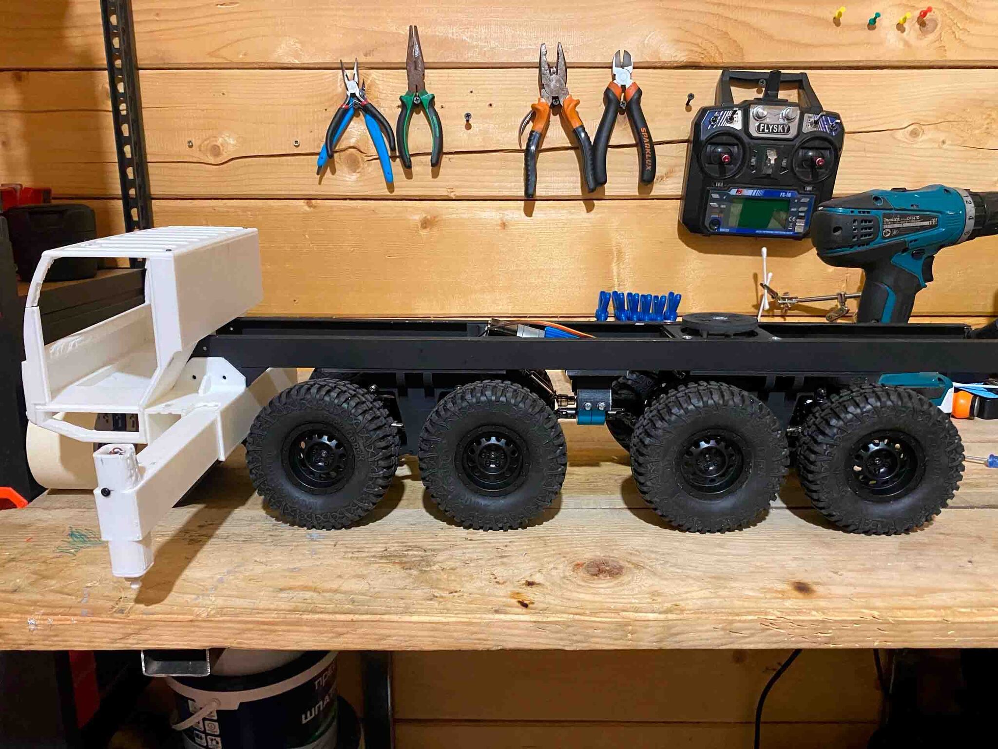Расскажу  немного о том, что уже сделано: За основу идет рама из алюминиевого П-образного профиля. Мосты от JJRC, к слову все оси будут рулевые как в оригинале, будет и крабовый ход. Во всех мостах установлены дифференциалы. Амортизаторы с алиэкспресса, и далее уже 3Д печать. Шасси поделено на две тележки по две оси на каждую. На каждый мост своя серва SG90 (но это пока, SG90 на тестах показала, что сил у нее не достаточно для этих колес). И да напомню, это пока будет черновая модель, так как это первый опыт. Главное чтоб она полноценно заработала, а потом либо ее дорабатывать и улучшать, либо оставлю как макет и следующую уже собирать хорошею и с каким не каким опытом.