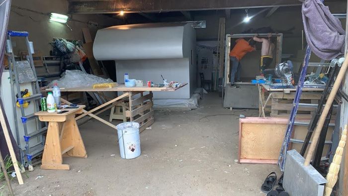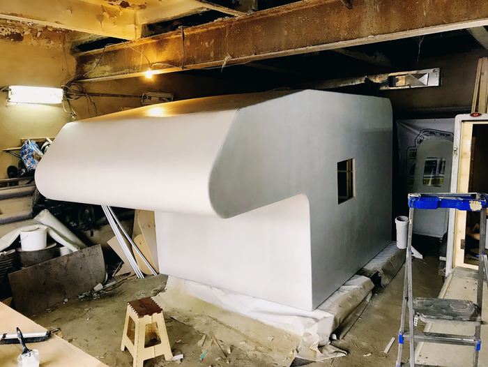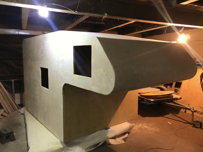 Всем привет. Ну абсолютно нет времени что бы осветить процесс построек наших жилых модулей. Я уже говорил что мы начали мелкосерийное производство кемперов для пикапов и грузовиков. В прошлый раз я остановился на том что мы покрыли модуль стекломатом и зашкурили его. Сегодня мы покрыли его гелькоутом. Гелькоут это специальное покрытие, которое используется для яхт. Очень прочное, напоминает что то среднее между керамикой и пластиком.