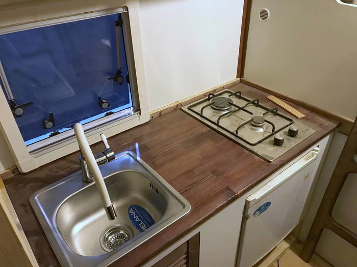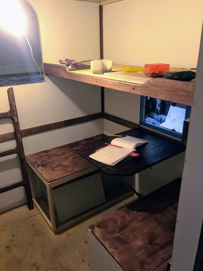 А столовая зона спокойно трансформируется в полуторную кровать 178*100 см. А в дневное время можно обедать за этим столом даже не поднимая кровать. Как в плацкарте на боковушке))