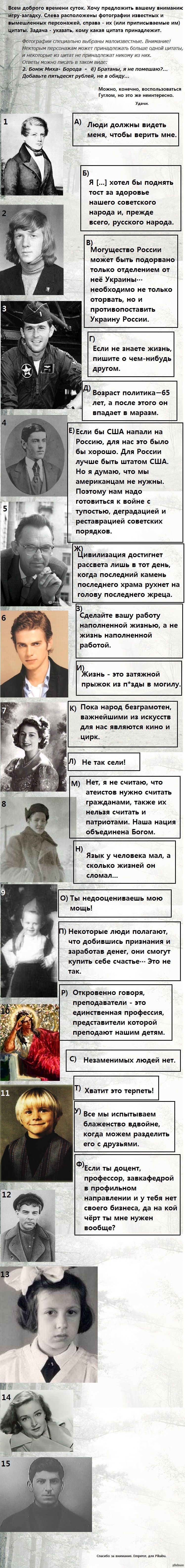 11 Emperor Пост-Загадка 12 лет назад Длиннопост. Предлагаю угадать, кому какие цитаты прпинадлежат. [моё] Длиннопост Загадка Цитаты Личность