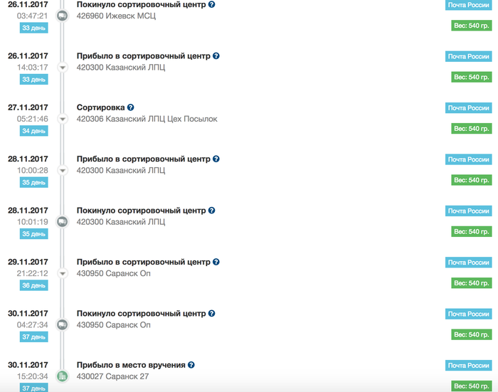 Далее, она должна была ехать в Саранск, расположенный в 650 км от Москвы. Поезд это расстояние проходит за 8 часов, но в итоге посылка ехала немного дольше. 5 недель. 35 дней.