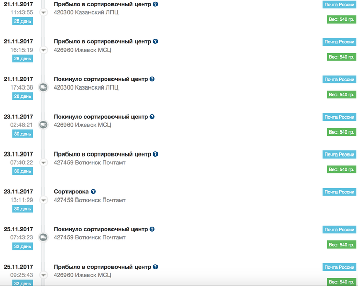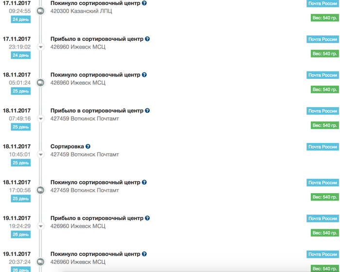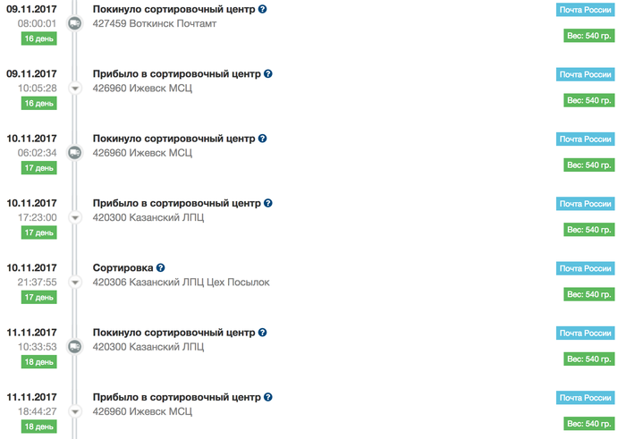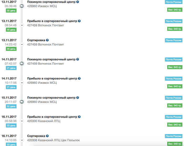 // далее посылка перемещалась туда-сюда (Воткинск-Ижевск-Воткинск-...) на полсотню километров 9 раз в течении трех недель, накатав 500 км: