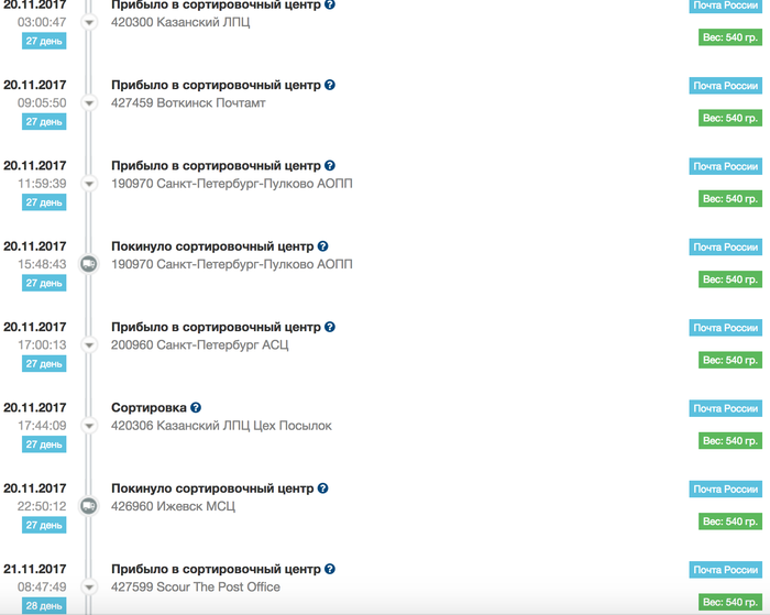Итак, выкладываю ключевые точки перемещения посылки: