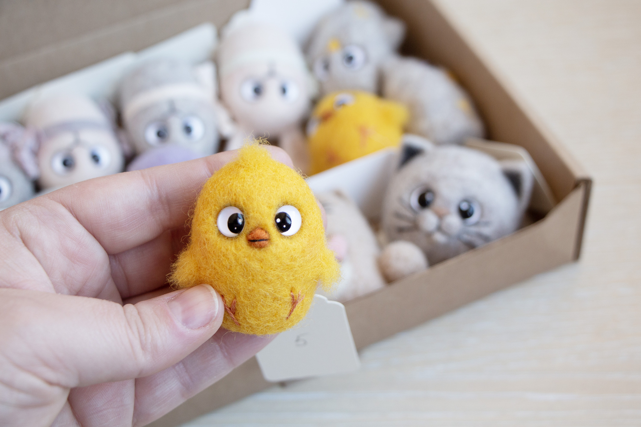 Все игрушки выполнены из овечьей шерсти в технике сухого валяния, утяжелены металлическим гранулятом, тонированы сухой пастелью. Вышивка нитками мулине, глазки стеклянные.