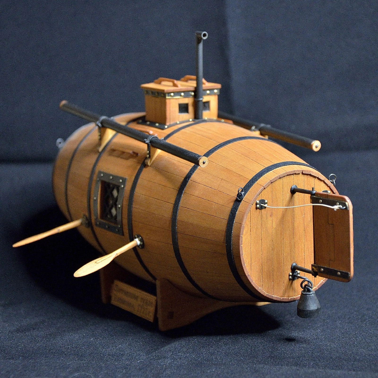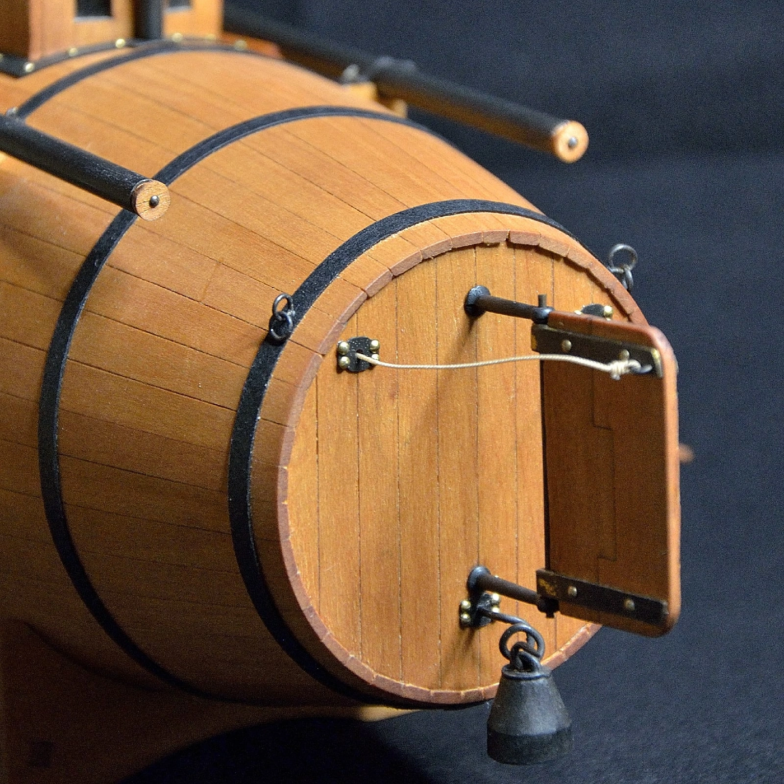 Каркас собирается из нарезанной лазером берёзовой фанеры. Все видимые деревянные элементы - груша, обручи - черный ватман. Латунь зачернена средством Brass Black, канатик управления рулём самовитый.
