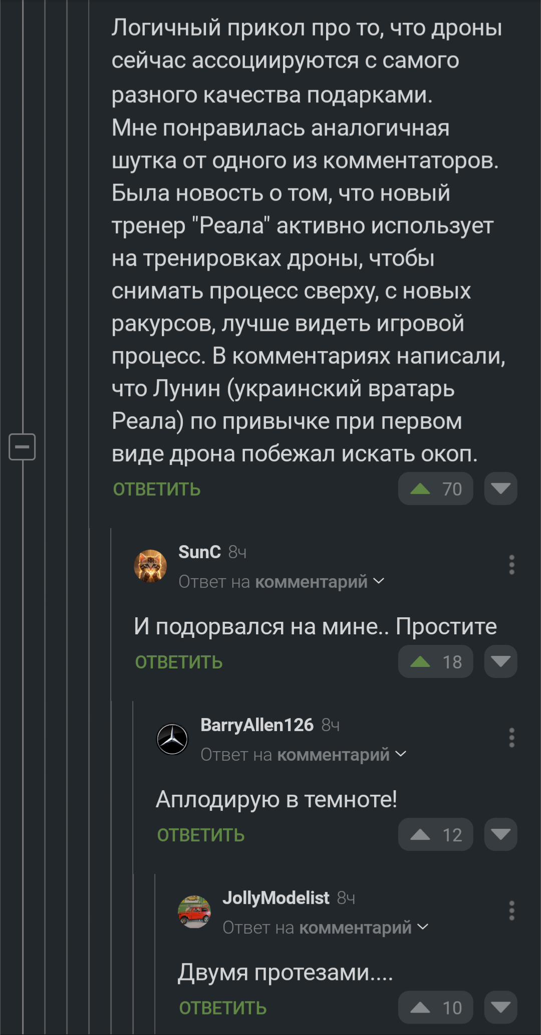 27 shaman9445 1 месяц назад Потемнело... #comment_367550198 Скриншот Комментарии на Пикабу Черный юмор Дрон 1 Ещё 0