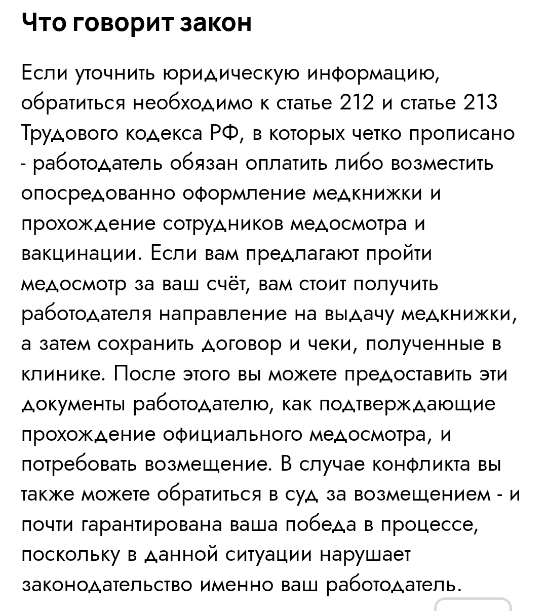 Я обрадовалась. Окей, думаю. Супер. Медкнижку по направлению от работодателя оплачивает работодатель. Без исключений должен. Обязан. Хош-не хош. Обязан. По договору с клиникой или клиника ему сразу счёт выставляет или работник с чеком приходит и работодатель компенсирует расход. Это не по выбору работодателя. Работодатель так должен. По закону. Российской Федерации.