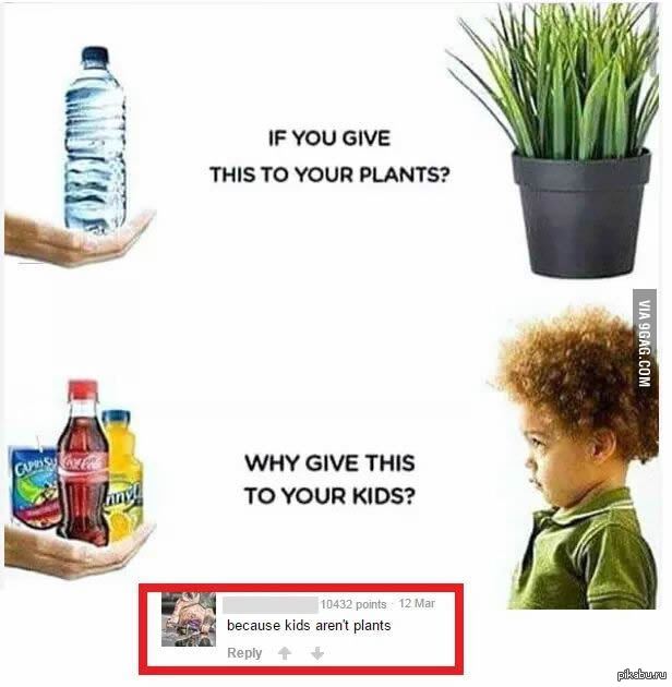 1225 daredevill 10 лет назад Потому что не растение) Почему вы даете это(воду) растениям? А почему это(напитики) даете детям? коммент радует: Потому что дети не растения))))) снайнгагжено :D Почему? Вода Напитки Дети Растения Вред