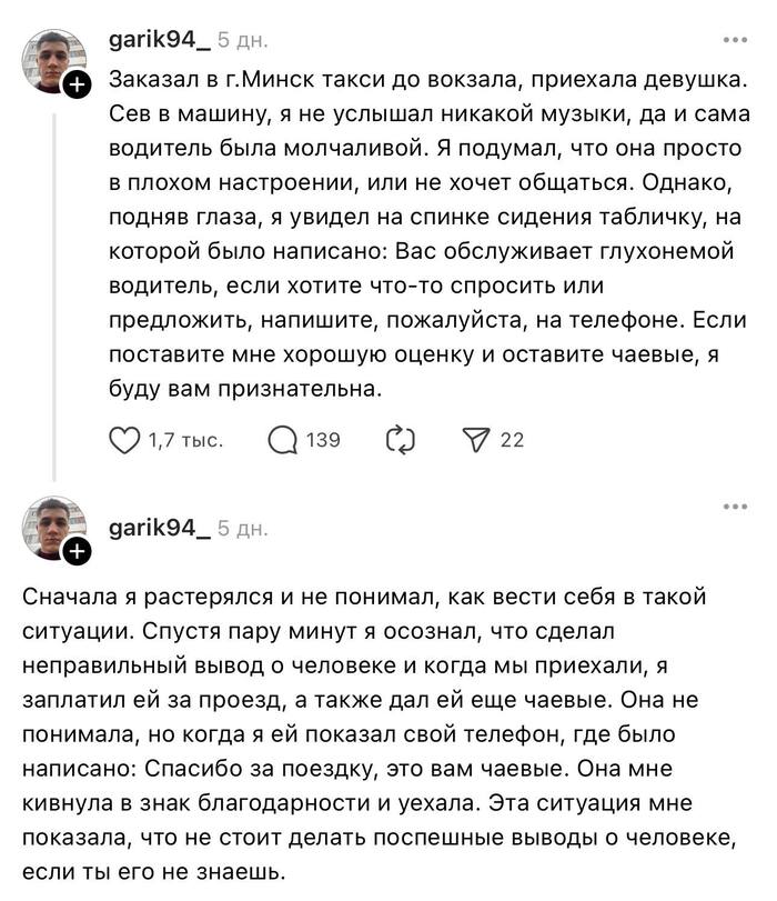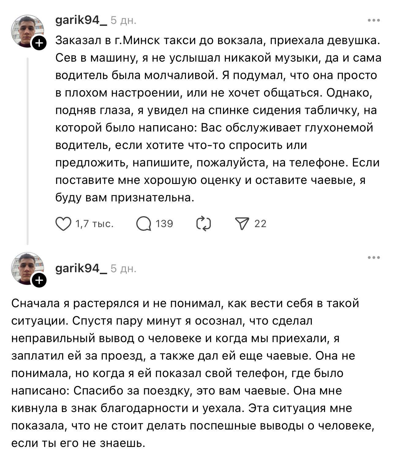 3 wagonmoi 5 дней назад Поучительная история из Минска Такси Скриншот Таксист X (Twitter) Доброта Ещё 0