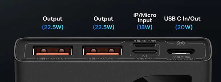 Поддерживает зарядку Самсунгов/Сяоми (QC18W), Хуавей (SCP22.5W), Айфонов (PD18W/PD20W). Дополнительно есть вход MicroUSB для зарядки. USB-C двунаправленный. Емкость 37Wh (10Ah 3.7V или 5.8Ah 5V при КПД 75%). Максимальное напряжение выхода 12V при токе 1.5A. Купить Повербанк Baseus 22.5W. При оформлении нажимайте на "взять купон".