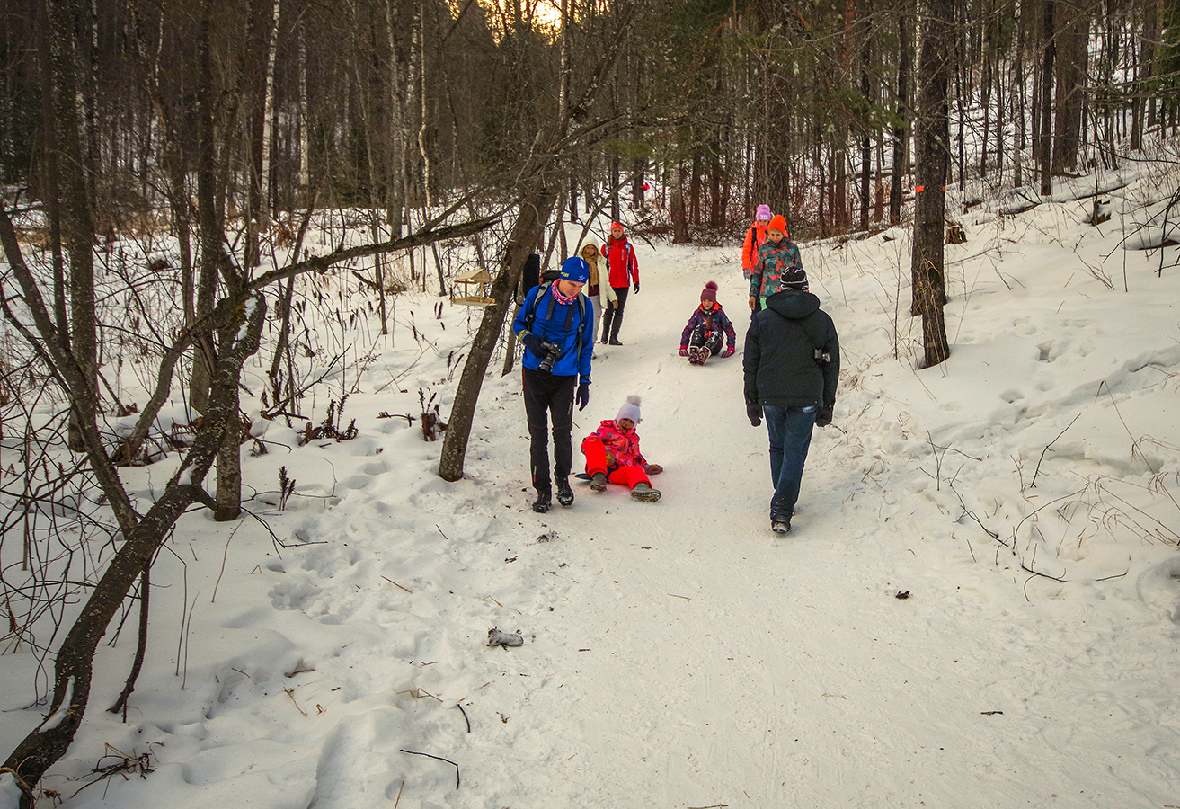 Дети с визгом и восторгом катались на ледянках, плюшках и просто на попе. Поднимаясь в горку, нам нужно было уворачиваться от пролетающих мимо радостных снарядов. В общем, никого из нас не сбили с ног.