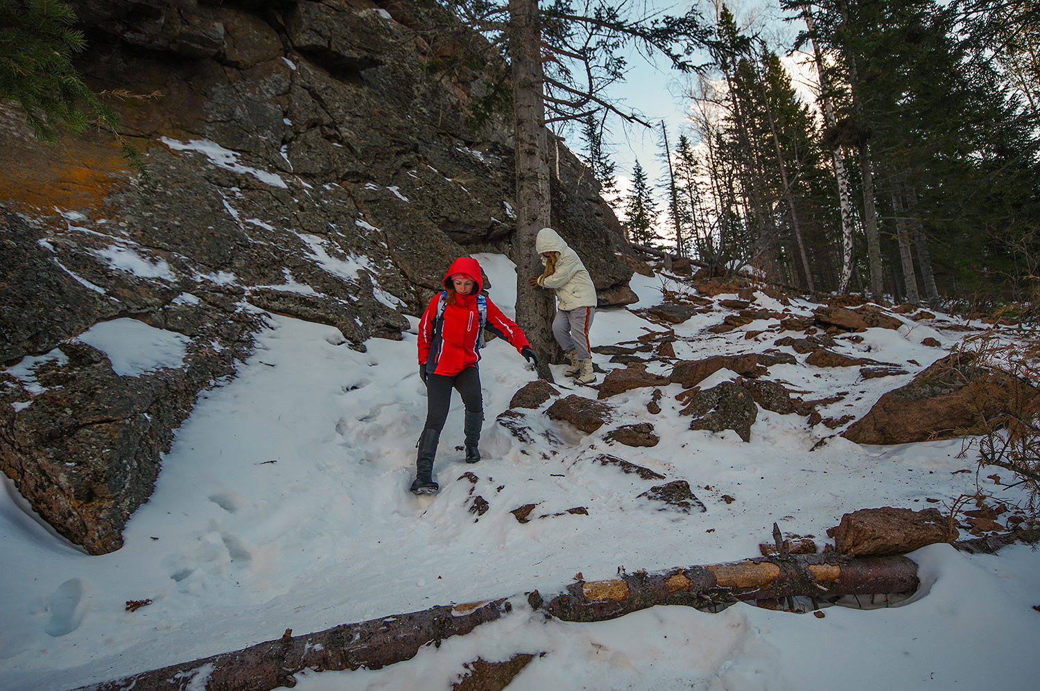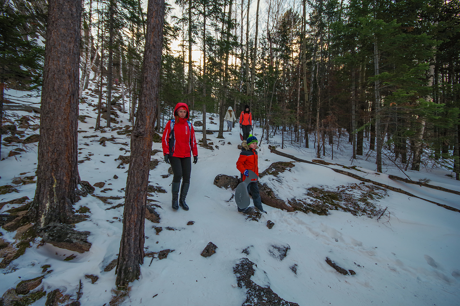 Мы лазили по скалам до полного укрепления иммунитета. Получив мощный заряд бодрости, отправились вниз. Выйдя на тропу, мы вновь подверглись атакам радостных детей, которые снарядами проносились по укатанному снегу.