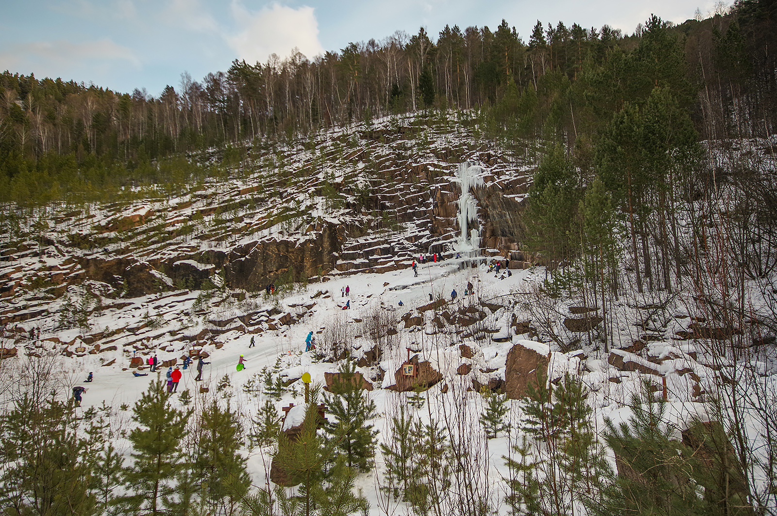 Гранитный карьер. Альпинисты с помощью шланга и насоса наращивают лёд для тренировок. А народ внизу - это вовсе не альпинисты, а просто активно отдыхающие.