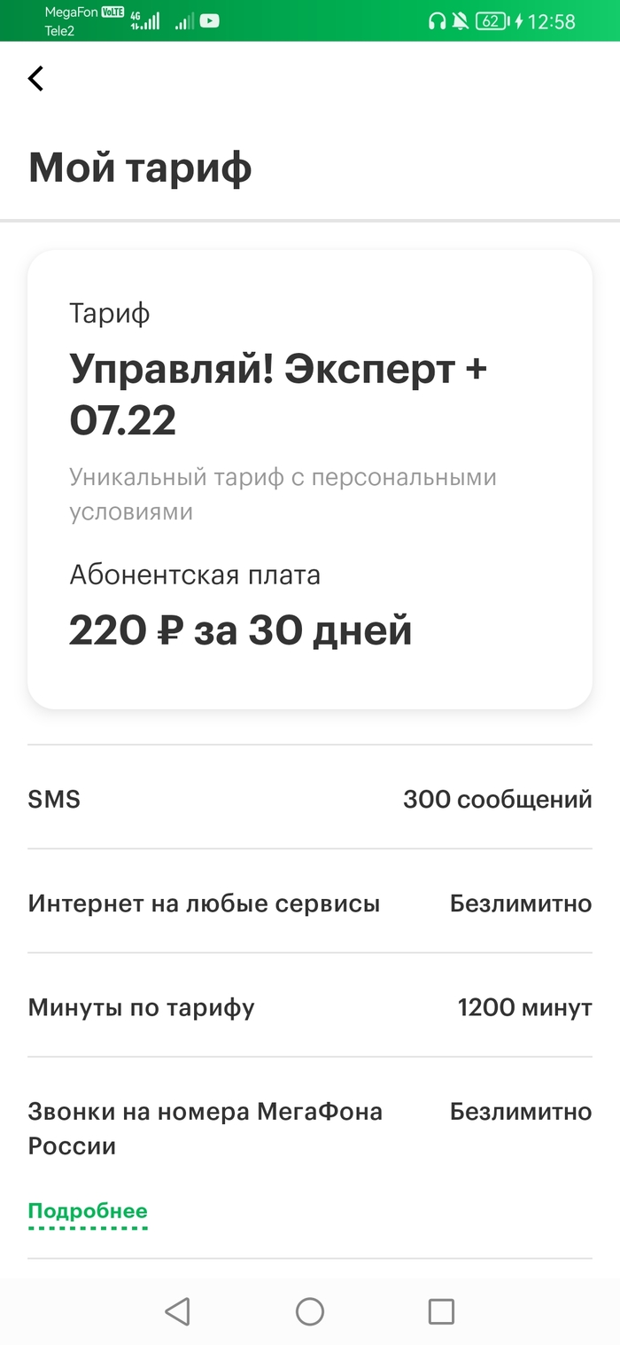 Ни для кого не секрет, что существуют архивные тарифы на разные операторы. Если вы трудоустроены, то вы можете обратиться к начальству и попросить подключить для вас корпоративный тариф. Лично у меня на мегафоне тариф на скриншоте ниже. Так же в услугу входит раздача интернета. Не реклама, а ответ!