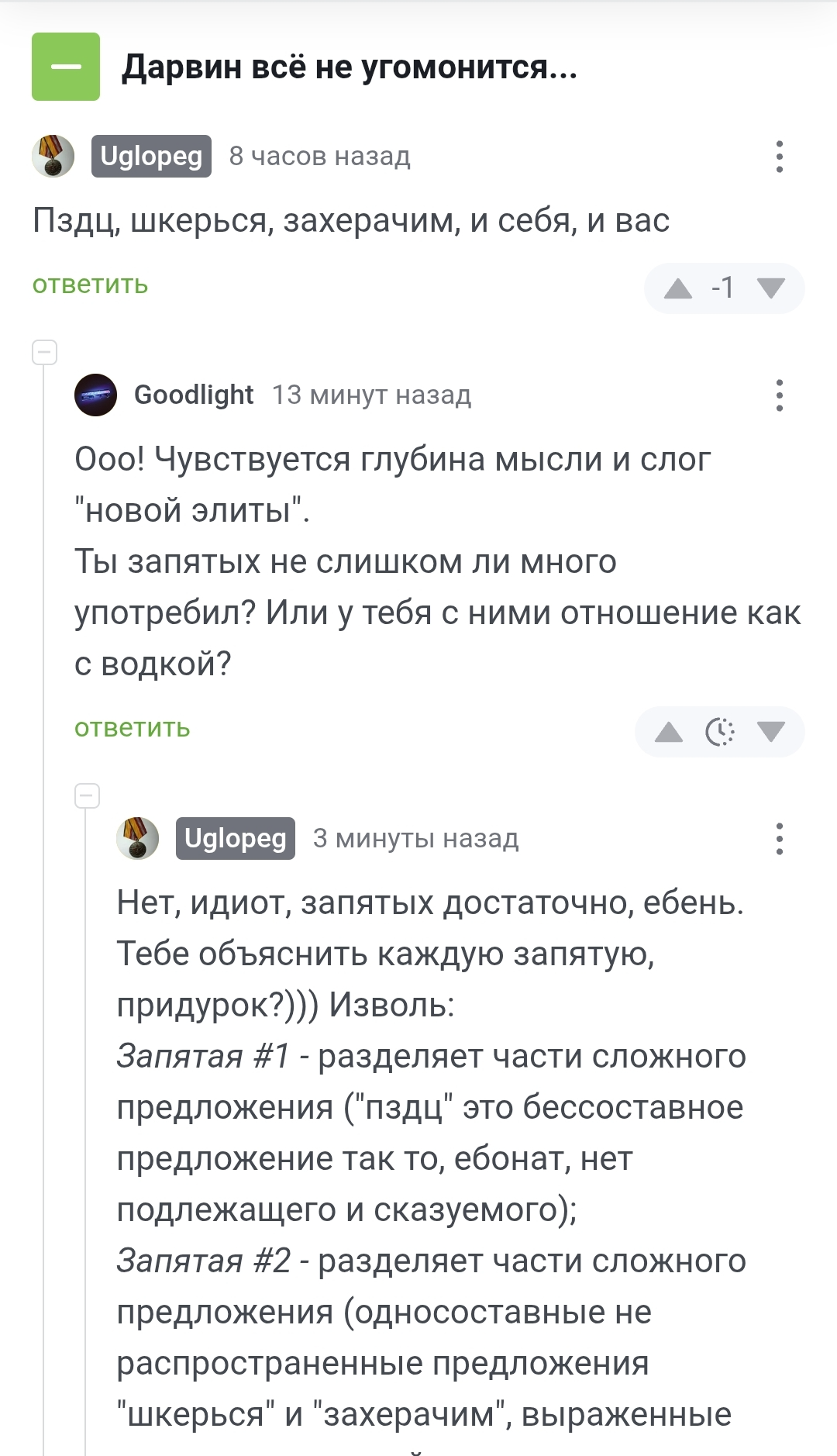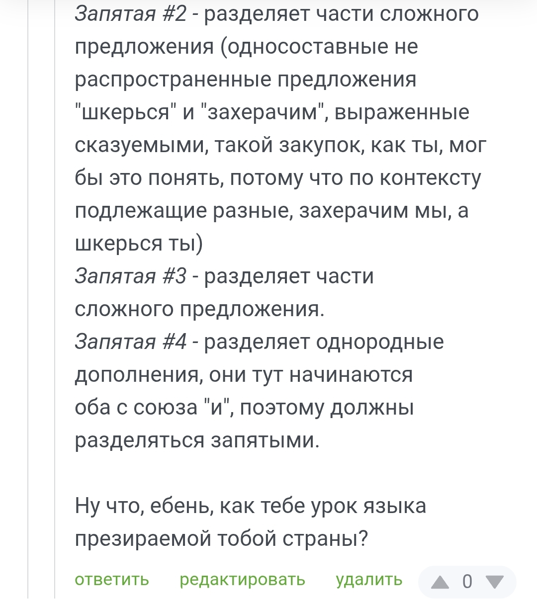 Урок русского языка для наших диванных оппозиционеров (правда, там реально третья запятая была лишней, но она всё равно объяснима и может быть поставлена). Печатаю анонимно, хотя за запятые пояснял я, в первый раз, посмотрим на реакцию.