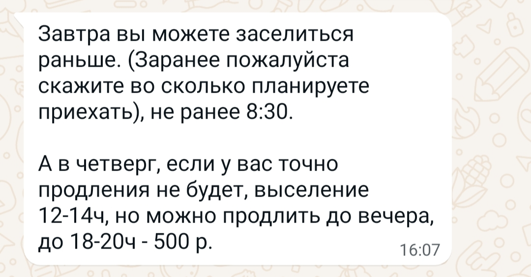 Выезд до 12.00 это ладно, заезд аж с 15.00, если хочешь заехать пораньше на пару часов - оплачивай доп.сутки. С детьми до 12 лет нельзя ( у меня нет детей, просто интересно почему так ? Больше вероятности поломки чего-либо ? Тоже напишите, если знаете).