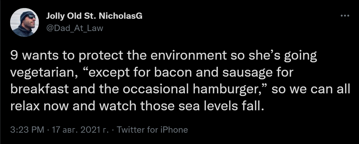 9-летняя дочка решила позаботиться об охране окружающей среды и стать вегетарианкой «кроме бекона и сосисок на завтрак и иногда гамбургеров», так что все мы можем расслабиться и наблюдать воочию, как снижается уровень мирового океана.