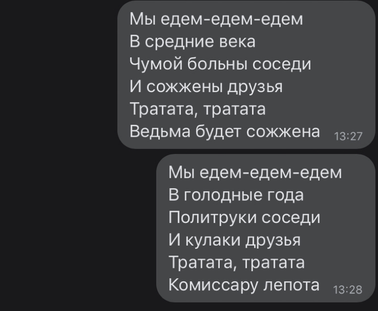 Сидели мы с моим другом и его сестрёнкой у него дома, на фоне играла музыка, ясень пень детская. Нужно сказать, что по некоторым физиологическим причинам я абсолютно не перевариваю некоторые жанры музыки и всю ту, что мне не нравится, поэтому голова после этого веселого караоке была у меня квадратная. Тем не менее я достаточно неплохо начал ностальгировать по своему собственному детству и вспомнил, как будучи мелким сам обожал эти песни, а иногда даже по настроению переписывал тексты некоторых, оставляя темп и ритм, и зачастую часу рифму. В этот момент на проигрывателе встала «Мы едем-едем-едем...» и мое больное воображение заработало на полную. Тогда я связался с другим своим другом, который часто любит писать очень неплохие стихи и обрисовал ему общую идею, как можно развлечься. Результаты в скринах, но я также предлагаю и остальным пораскинуть мозгами в комментах