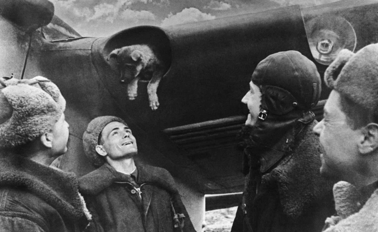 Советские лётчики со щенком в воздухозаборнике крыла бомбардировщика Пе-2 на аэродроме Москвы. 1944 год.