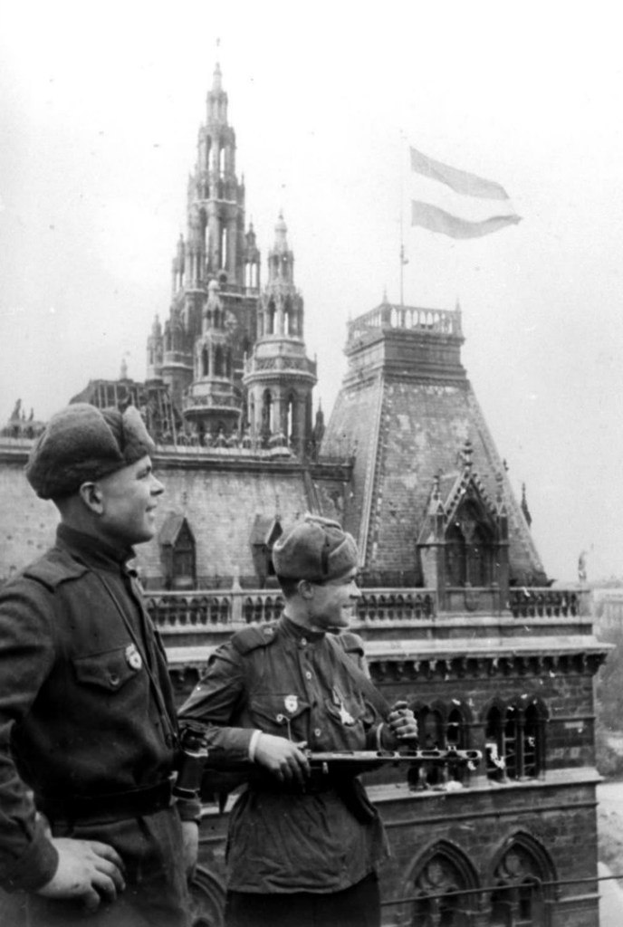 Гвардии старший сержант Павел Шефер и гвардии сержант Дмитрий Лугачев на фоне ратуши в Вене. Апрель 1945 года.