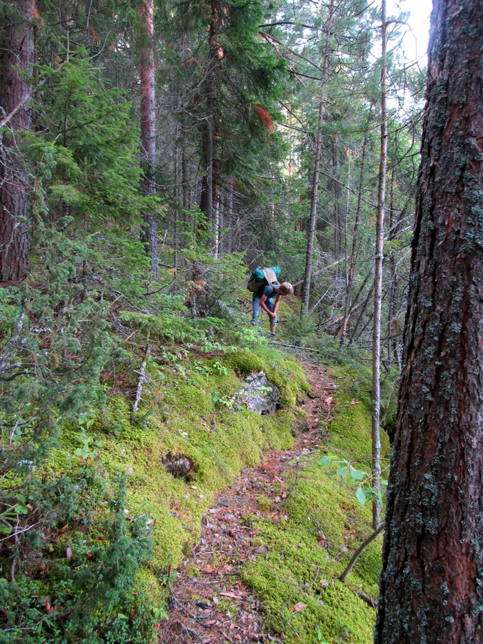 Случился любопытный случай - дорога (ну как дорога, старинное направление), по которой мы шли от храма, явно верная, воткнулась под прямым углом в изгибающуюся дорогу для лесовозов. Причём шли мы по компасу идеально в нужном направлении, а теперь у нас два направления дороги и оба равно откланяются от идеального направления. Конечно, от ошибки мы бы просто вышли на делянку с лесозаготовкой, но ошибиться очень не хочется - солнце уже потихоньку садится, ручьёв в этом лесу на холме никаких, то есть запаса нет ни по времени, ни по воде (от жажды мы не померли бы, но мы же любим комфорт, мы не великие покорители тундры и гор!).